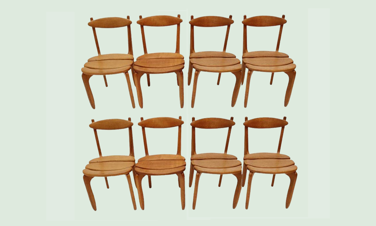 Set of Eight Minimalist Solid Oak Dining Room Chairs by Guillerme et Chambron