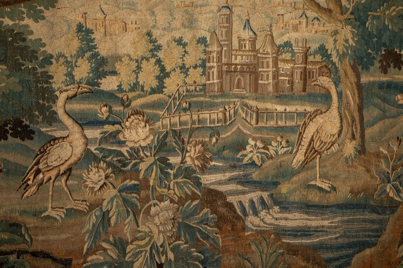A magnificent French verdure tapestry, woven in wool and silk at the renowned Aubusson workshops in the early 18th century. This richly detailed piece features a lush woodland landscape with delicate architectural elements and meandering waterways inhabited by elegant wading birds. The composition is framed by an intricately woven floral border that enhances the tapestry’s pastoral charm.
