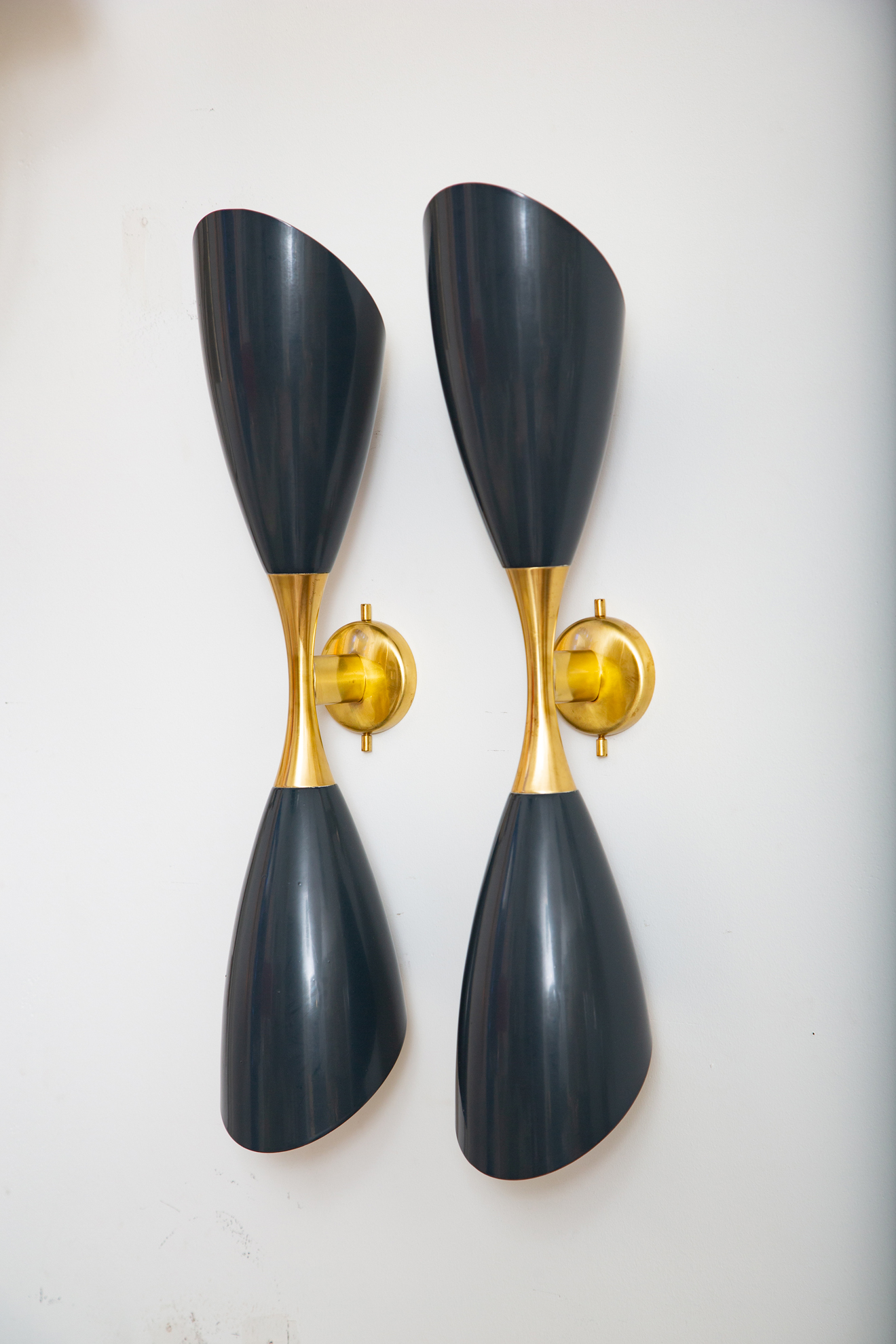 Pair of black enameled tole wall sconces with brass fittings. Up and down light.