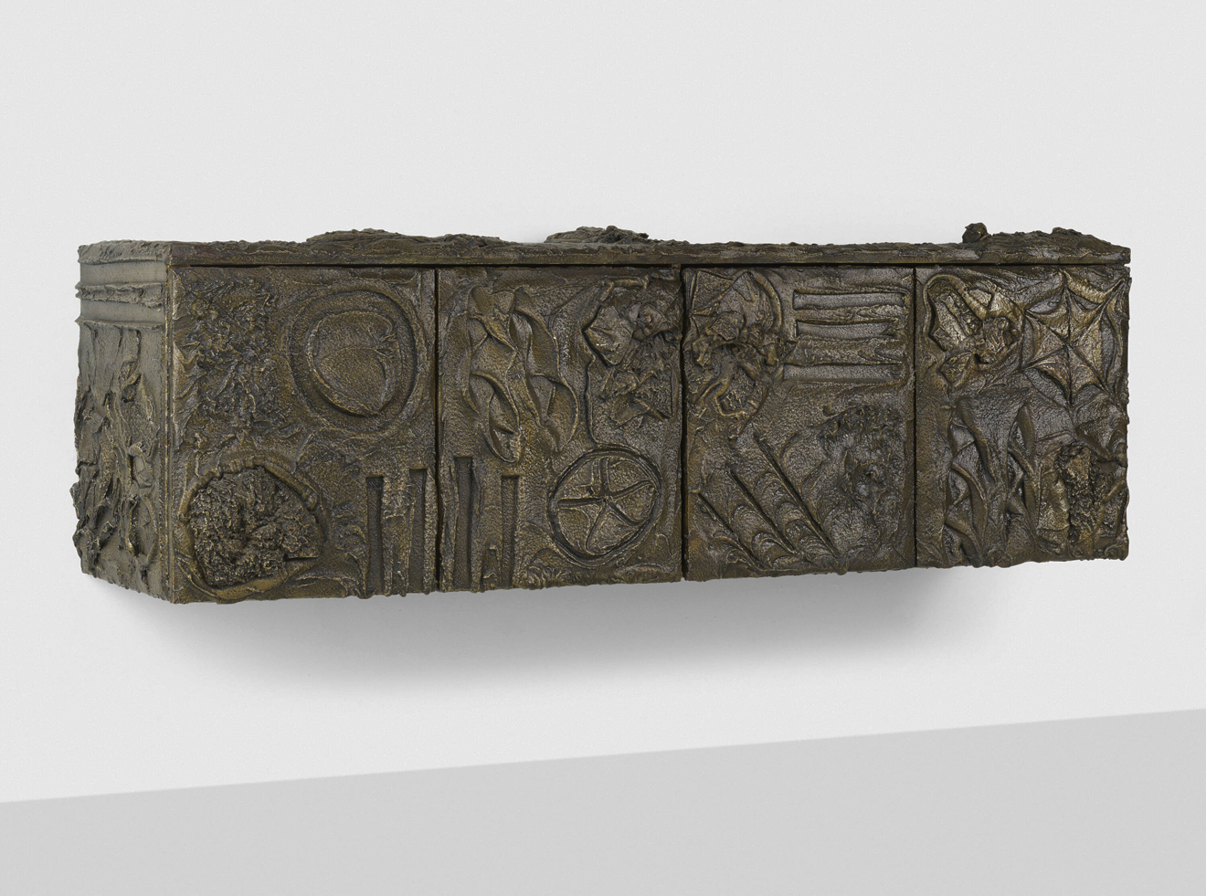 Paul Evans Brutalist sculpted bronze wall hanging cabinet.