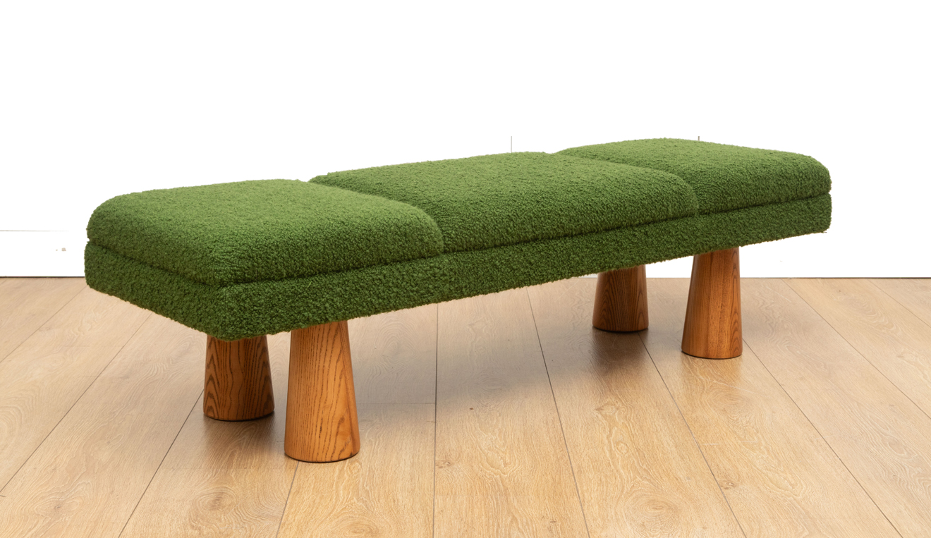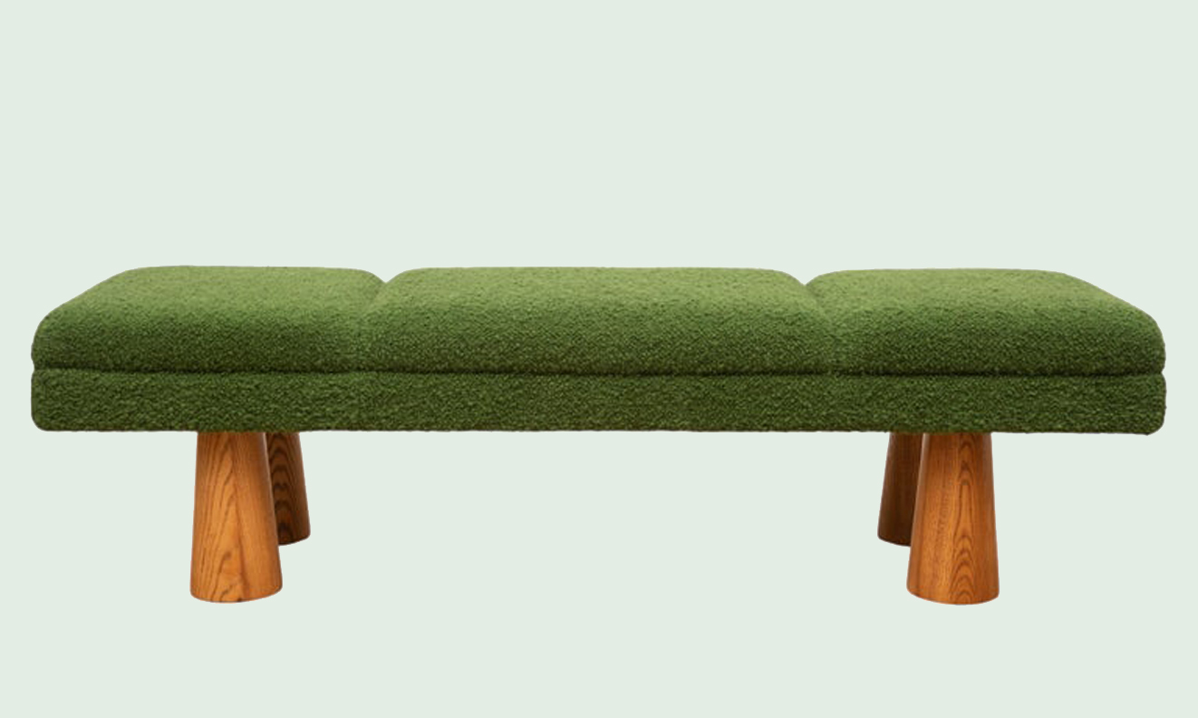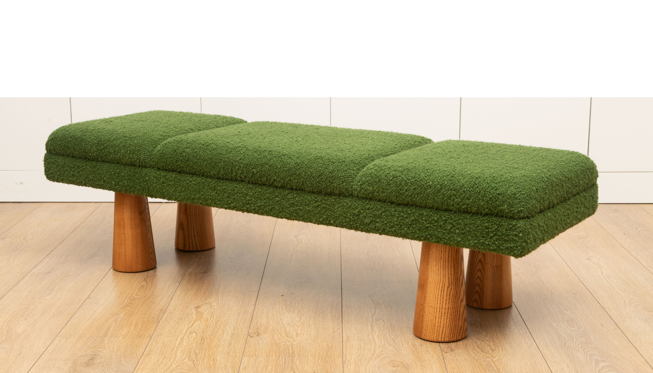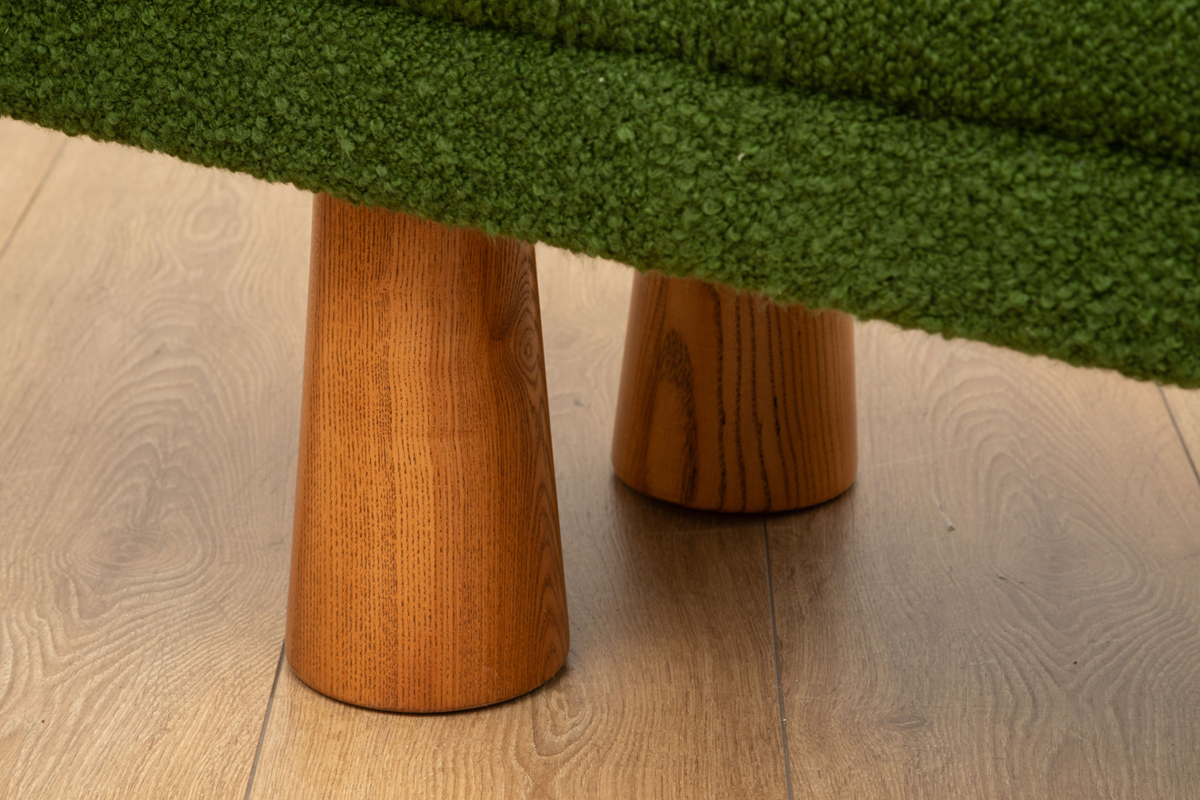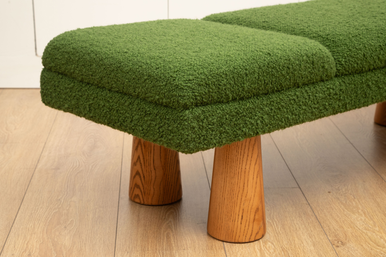 Sleek contemporary bench, studio built in Italy, featuring solid ash wood tapered legs and upholstered in textured hunter green bouclé. Clean lines and refined proportions create a versatile piece ideal for entryways, bedrooms, or living spaces.