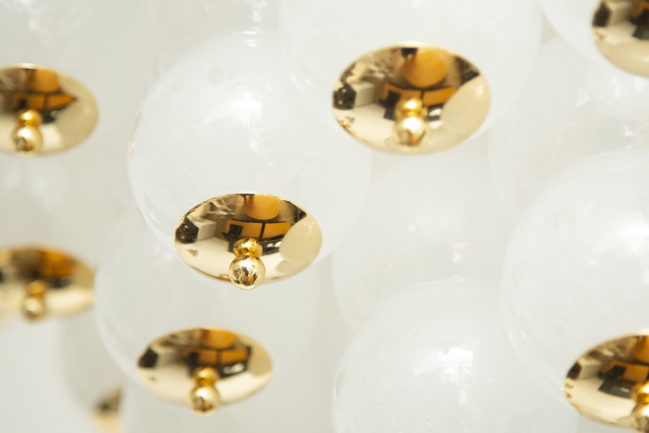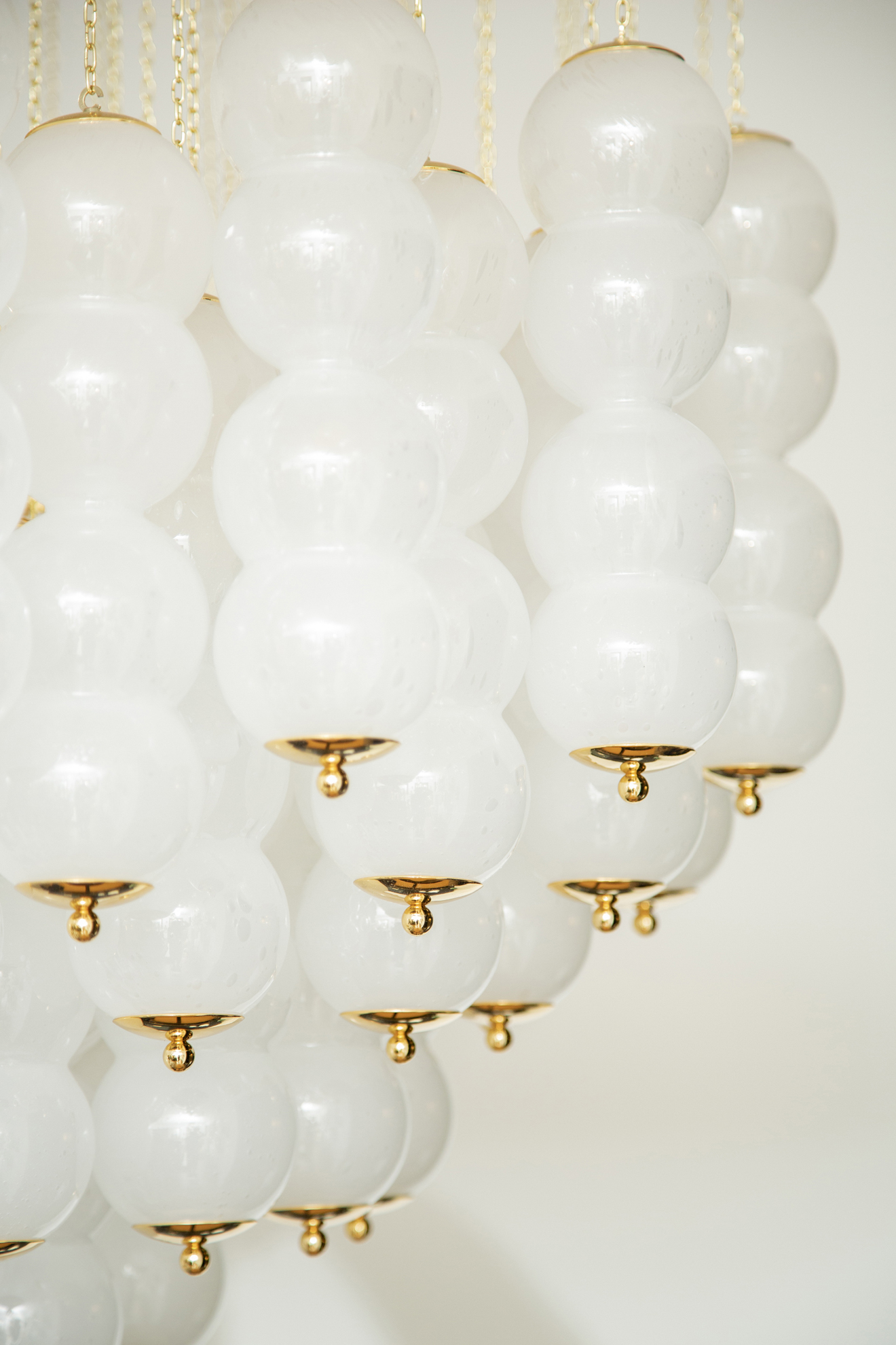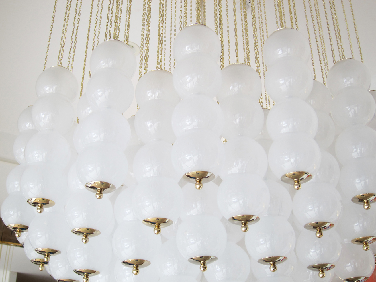 Flush mount conical Murano white glass and brass studio chandelier. Features 76 (4 balls) hand blown white glasses with tiny air bubbles suspended to 76 gold chains arranged to form a perfect conical shape. Flush mount brass ceiling plate Stunning design from all angles Available to view in situ at our showroom in Miami. Ready to ship.
