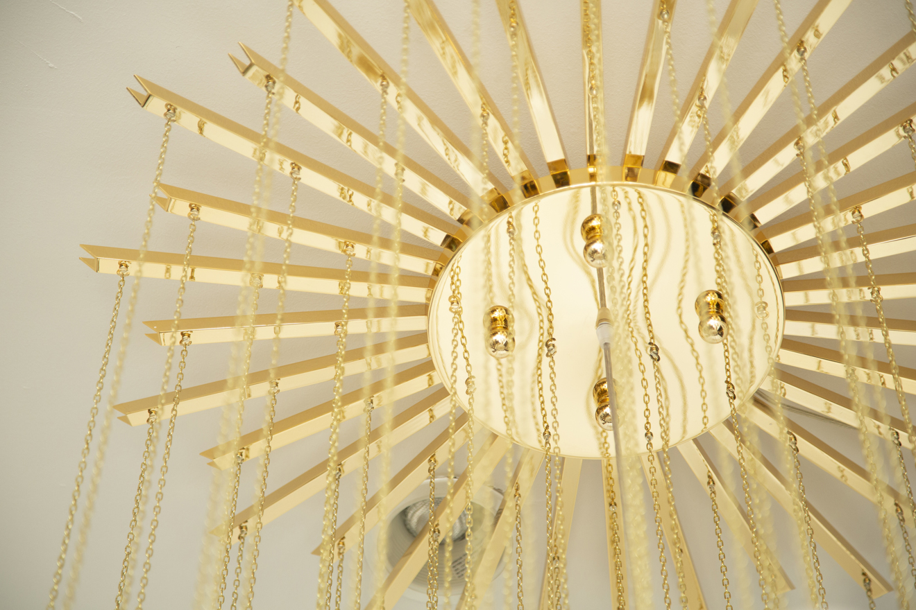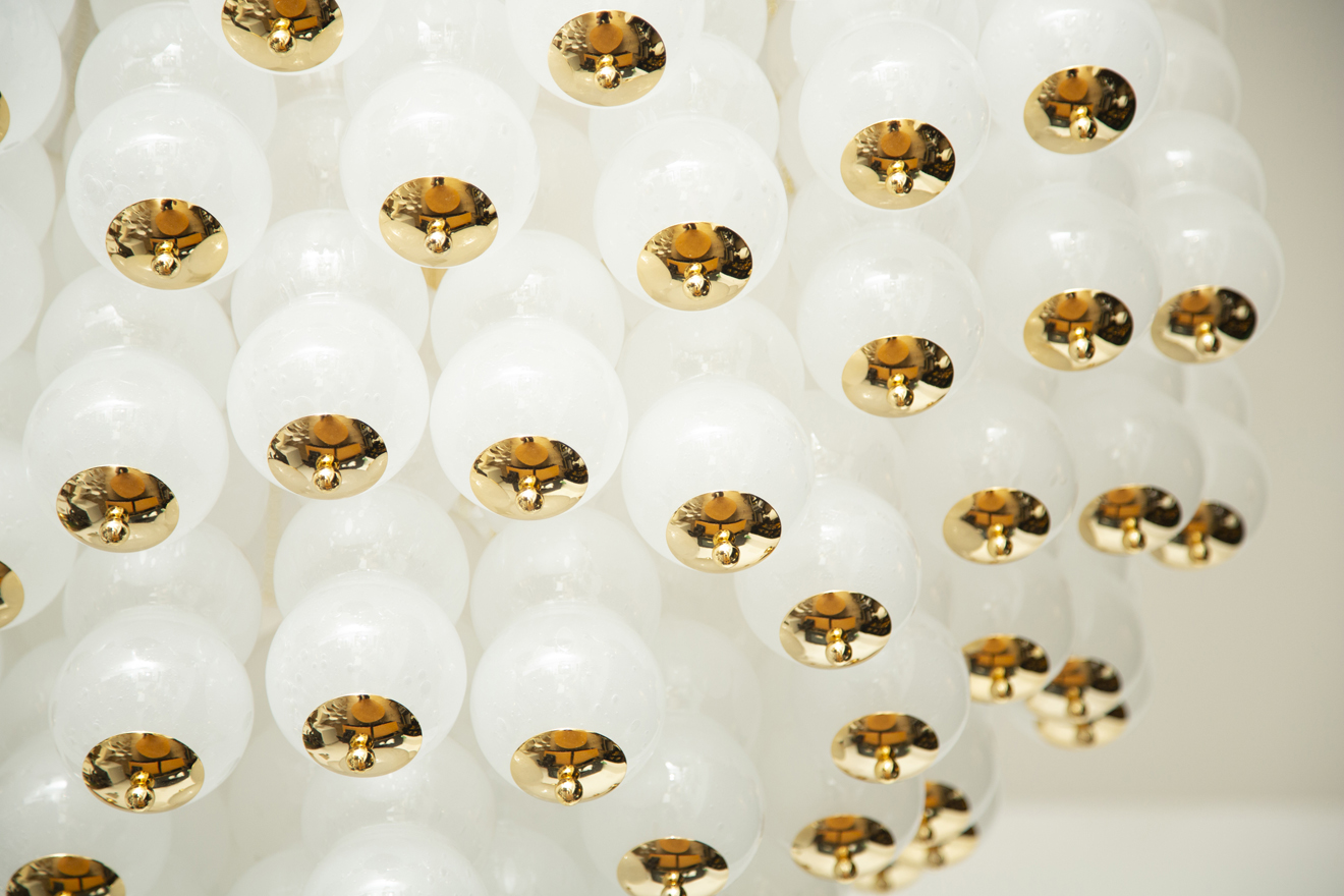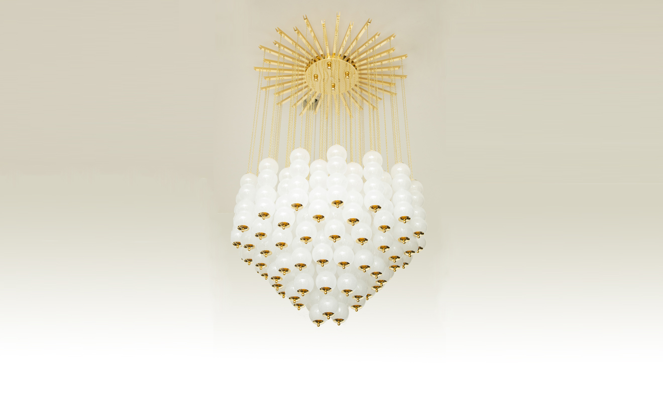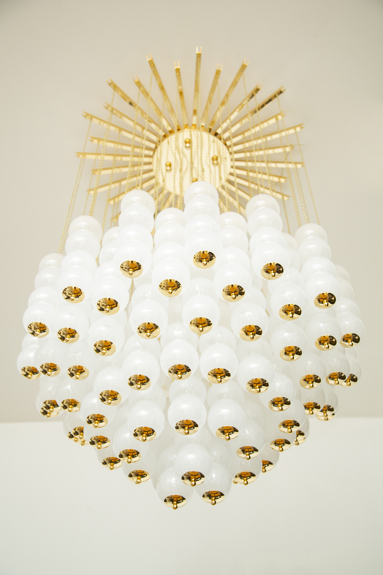 Flush mount conical Murano white glass and brass studio chandelier. Features 76 (4 balls) hand blown white glasses with tiny air bubbles suspended to 76 gold chains arranged to form a perfect conical shape. Flush mount brass ceiling plate Stunning design from all angles Available to view in situ at our showroom in Miami. Ready to ship.