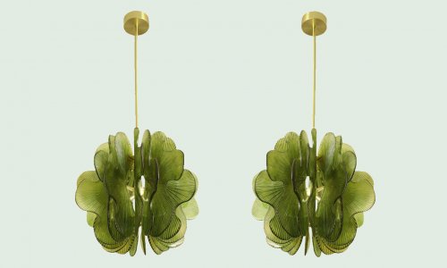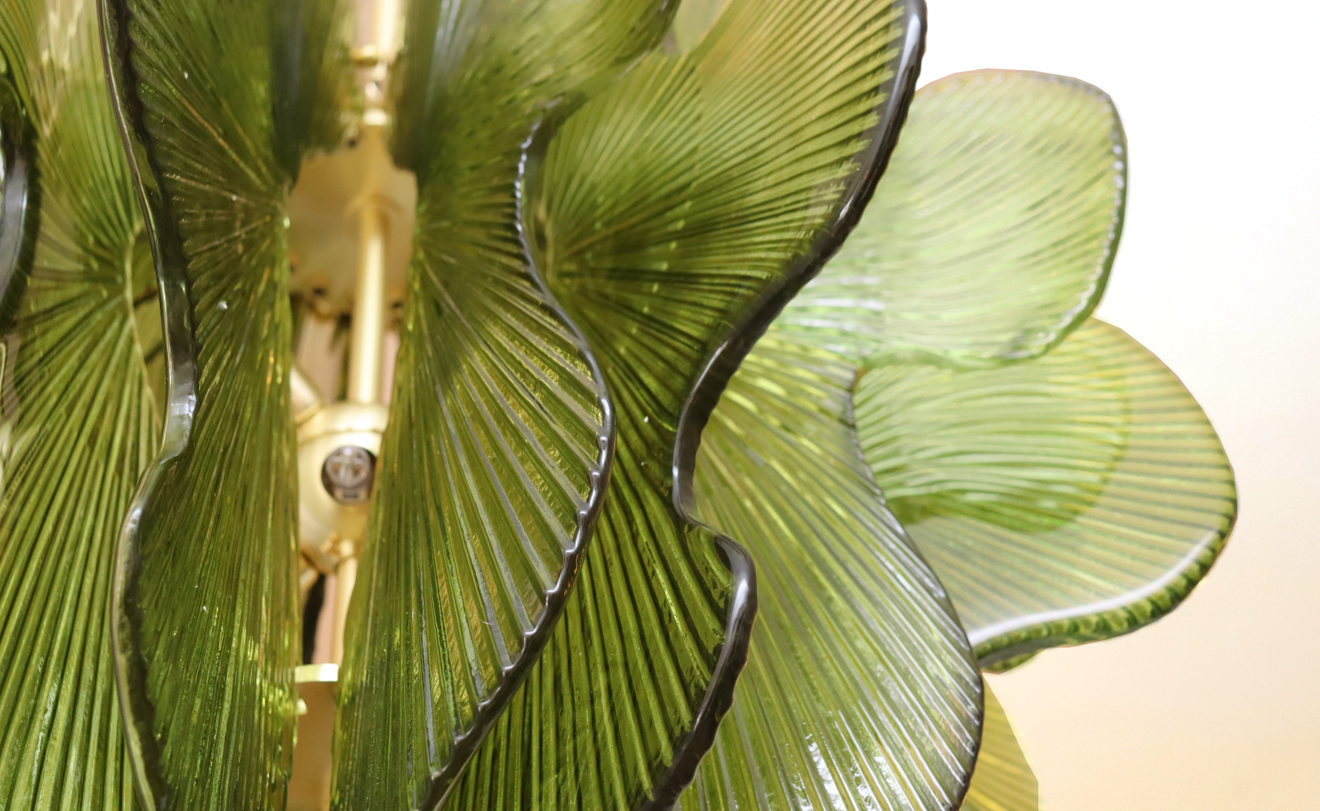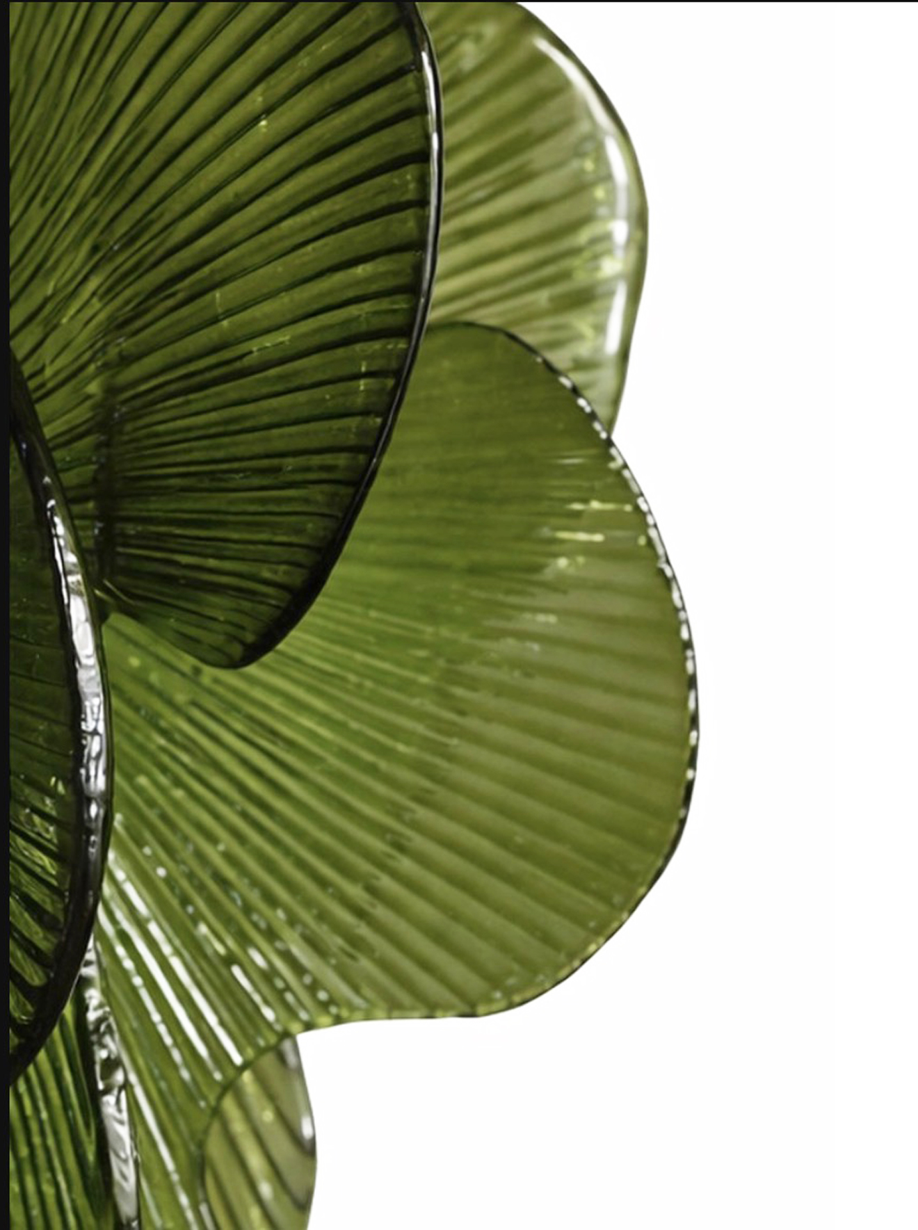 Modern green textured glass chandelier . Multiple vertical layers with wavy cuts give a fresh and vibrant look.