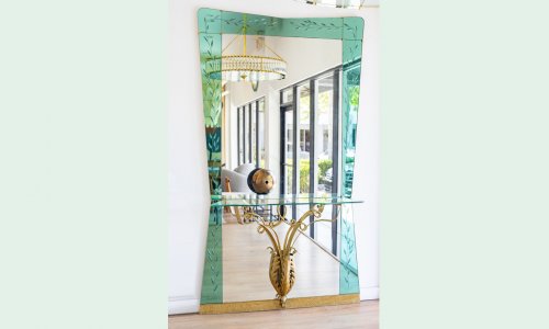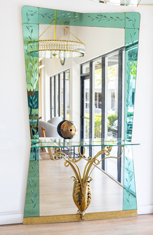 Italian mid-century modern hallway mirror with integrated console shelf by Pier Luigi Colli for Cristal Art , circa 1950.