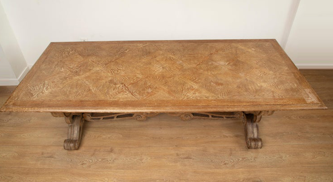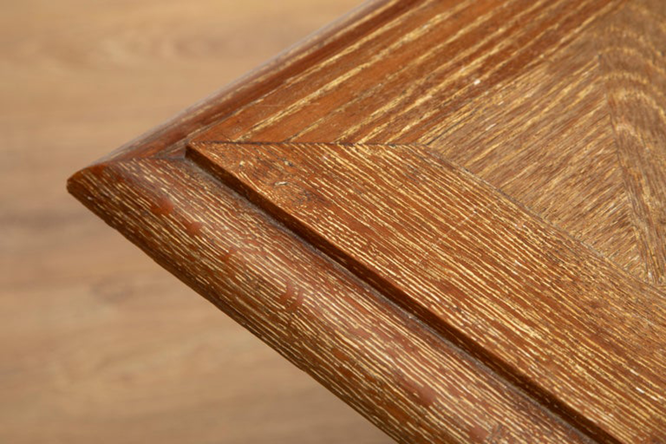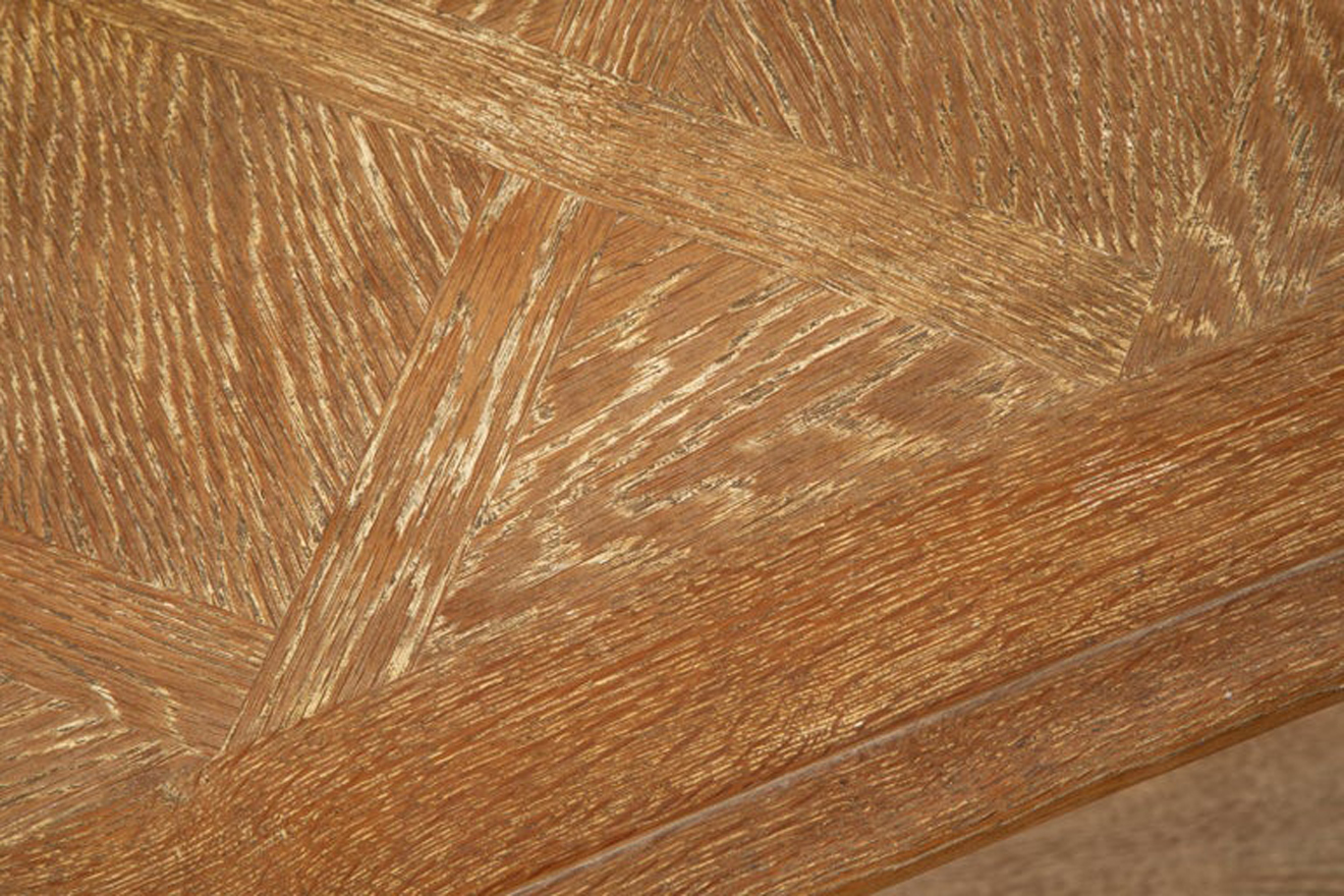 The thick ceruse parquetry top retains its original finish, offering a rich, warm patina that beautifully complements the solid oak construction. The natural grain of the wood enhances the table’s authenticity, while the years of use have contributed to its impeccable patina, adding depth and charm to the piece.