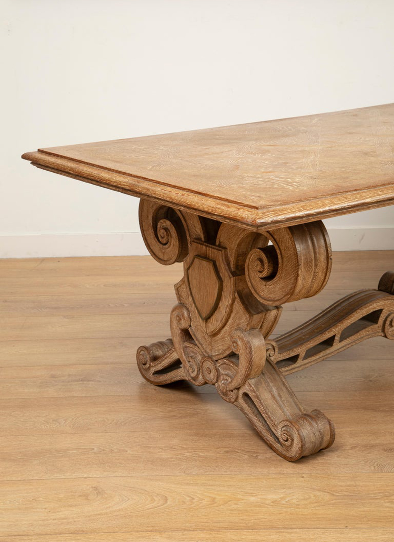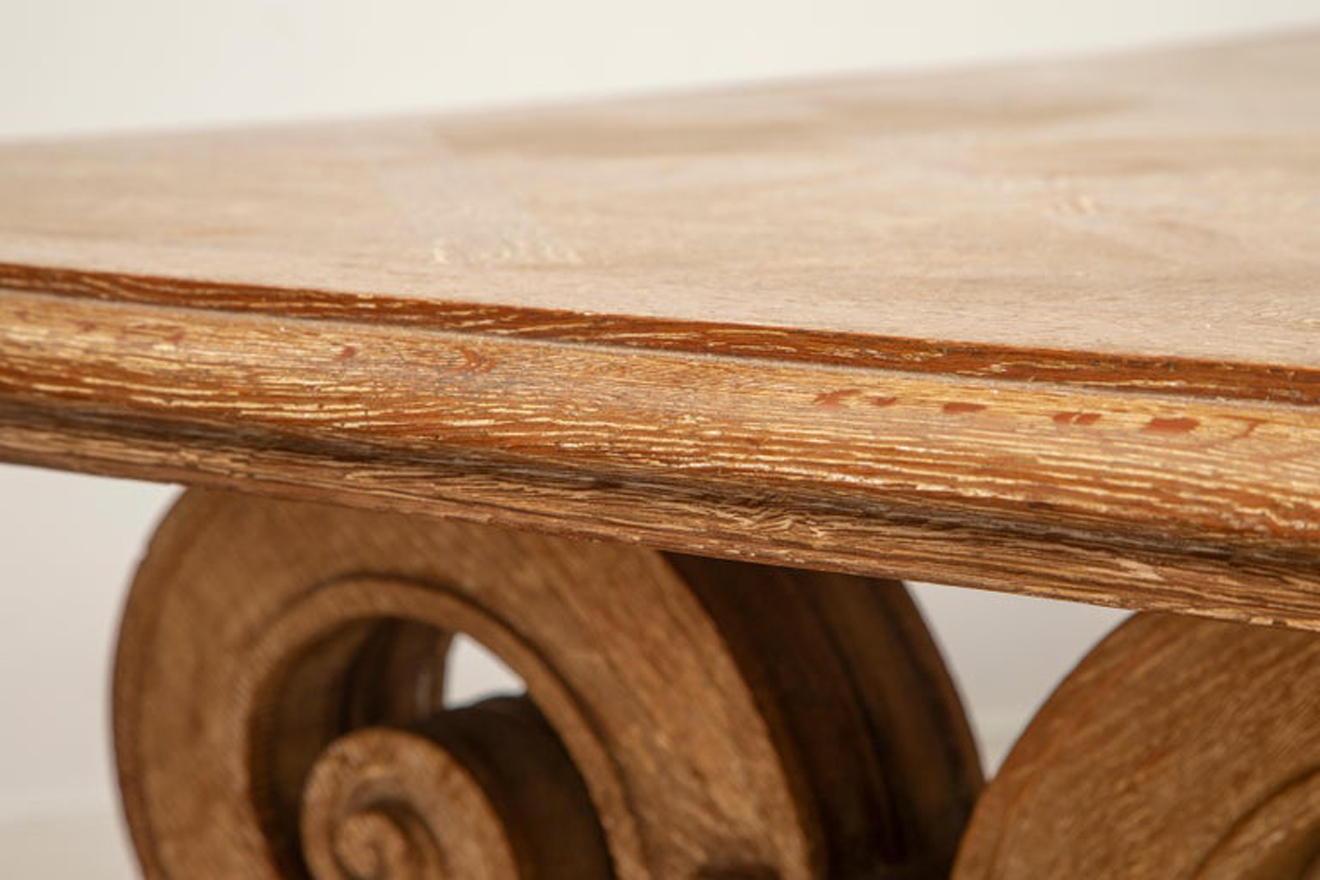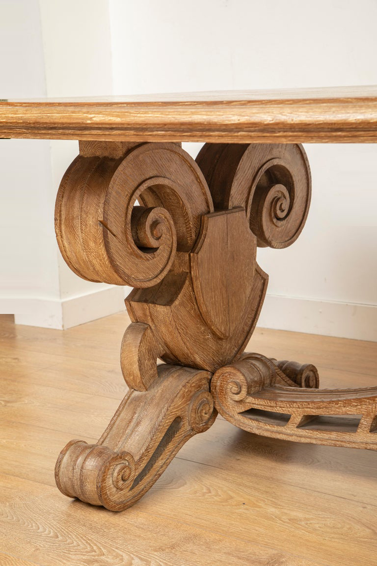This stunning large ceruse oak dining or library table, sourced in France circa the 1940s, combines elegance and history in a singular piece of furniture. The table features two intricately carved scrolled bases with an escutcheon in the center, elegantly connected by a detailed trestle base, showcasing expert craftsmanship from the period.