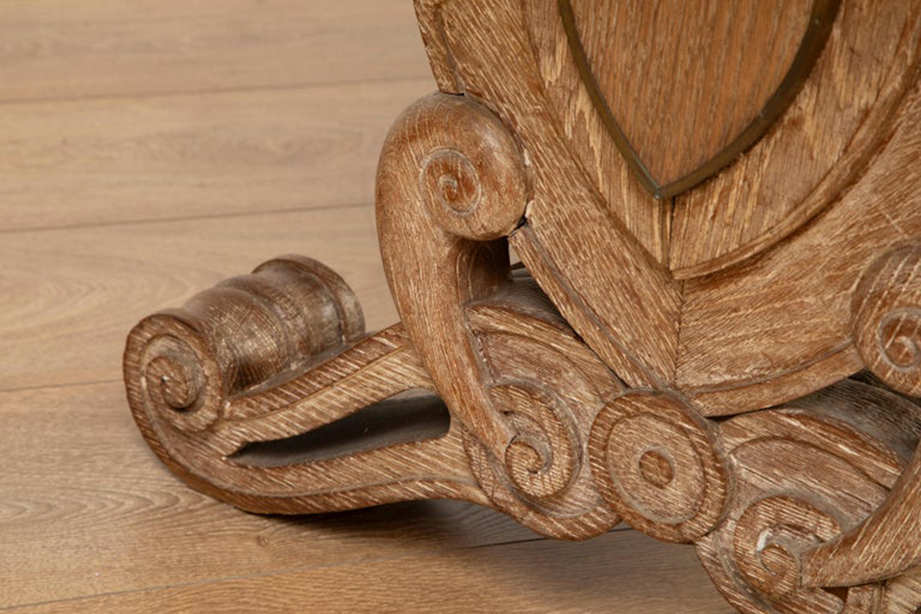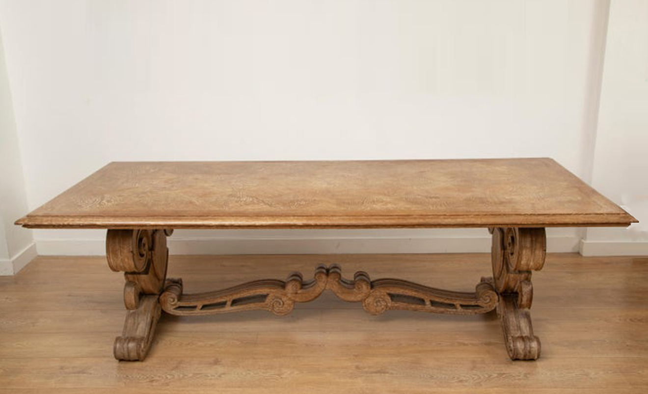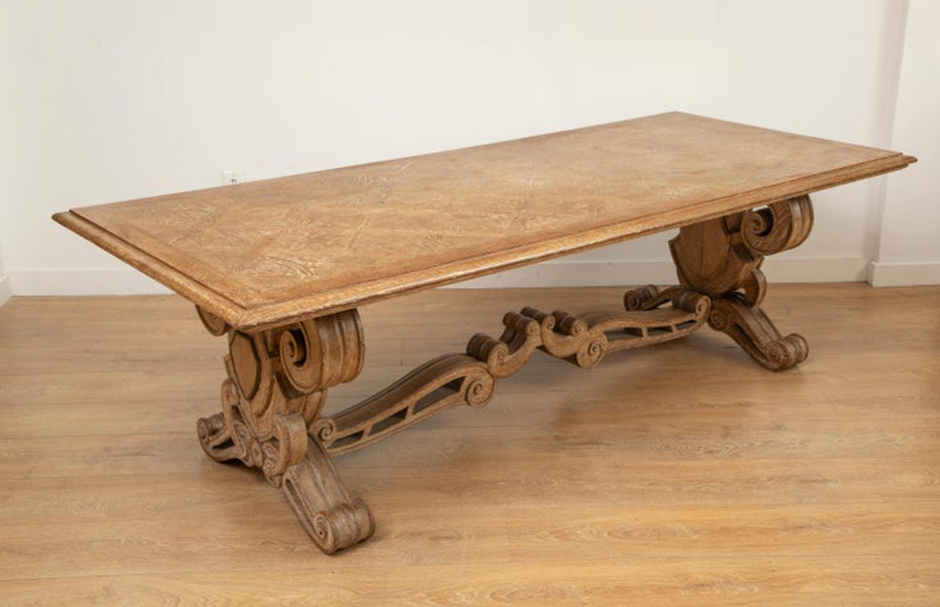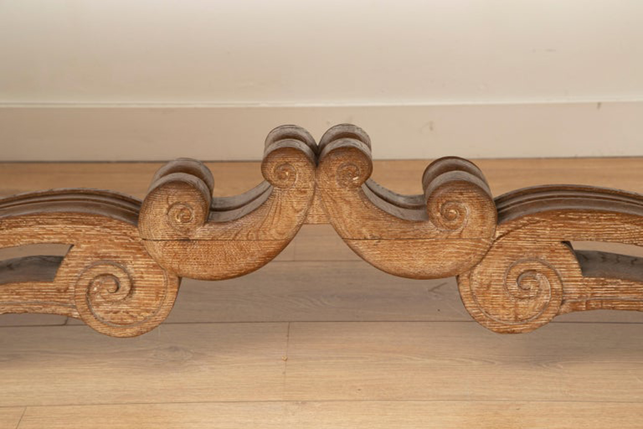 This stunning large ceruse oak dining or library table, sourced in France circa the 1940s, combines elegance and history in a singular piece of furniture. The table features two intricately carved scrolled bases with an escutcheon in the center, elegantly connected by a detailed trestle base, showcasing expert craftsmanship from the period.