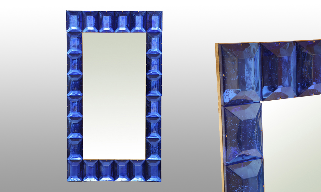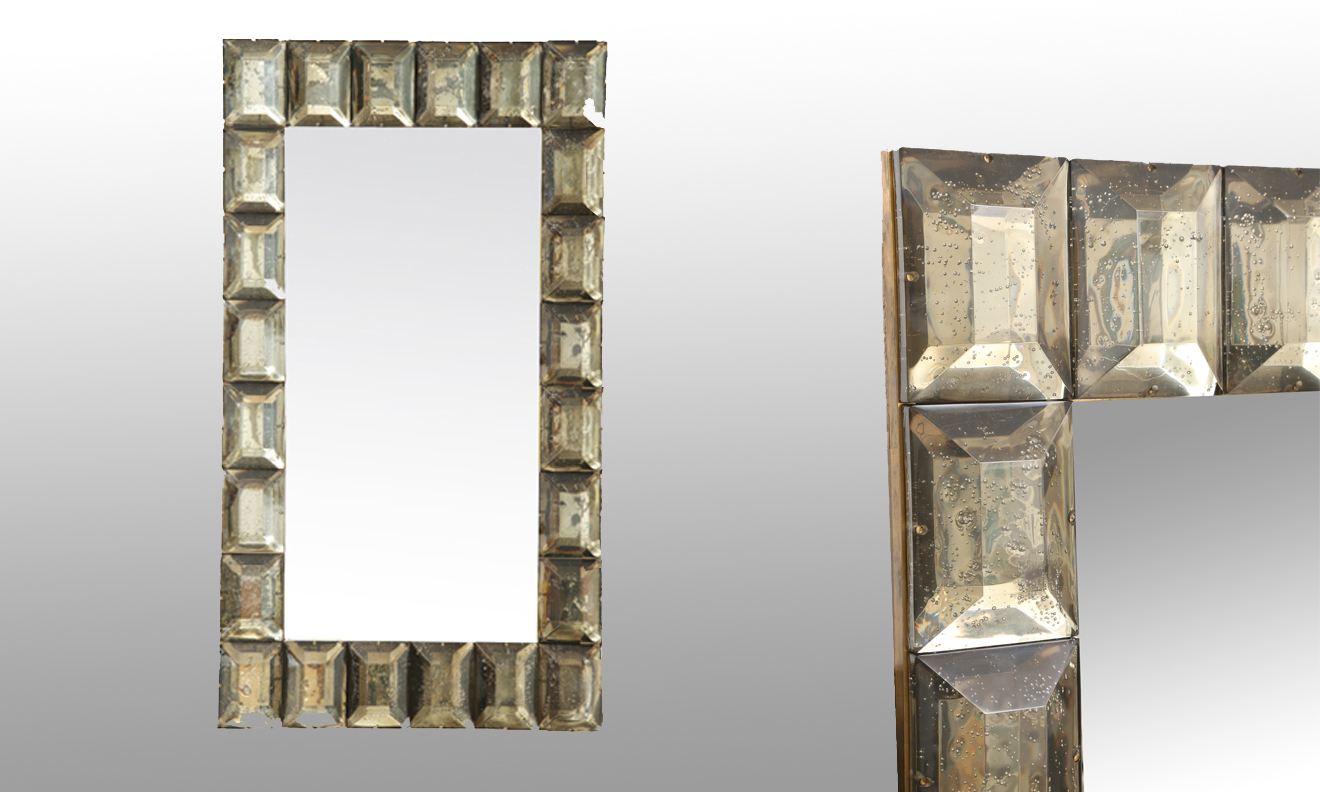 Each glass block has a highly polished diamond faceted cut pattern with air inclusions throughout.