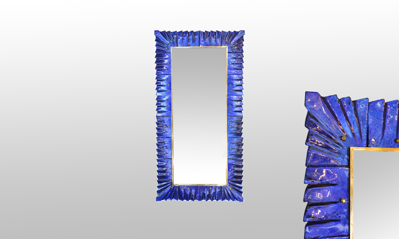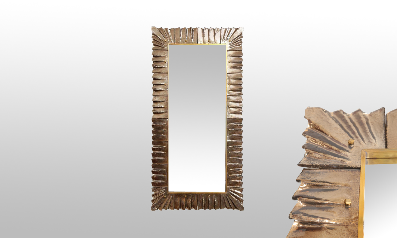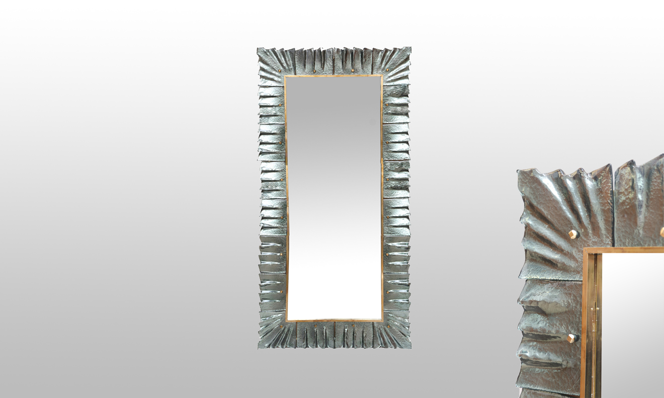 Large modern Murano glass and brass decorative mirror with solid brass cabochon accents. Glass texture and color are absolutely striking. Can be hung vertical or horizontal.