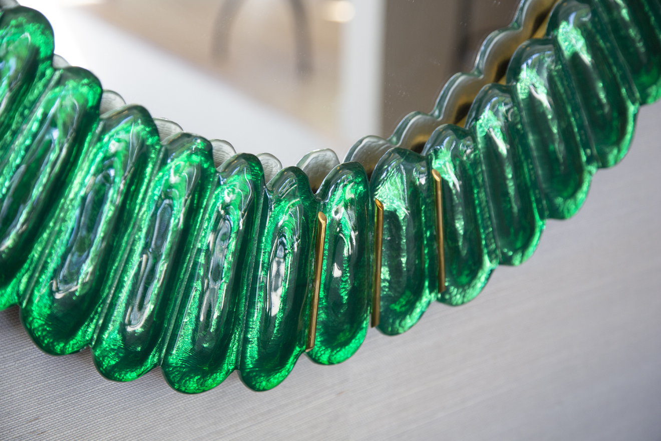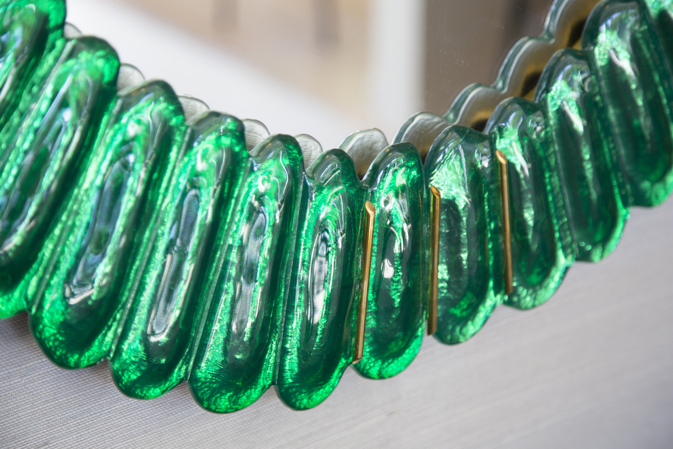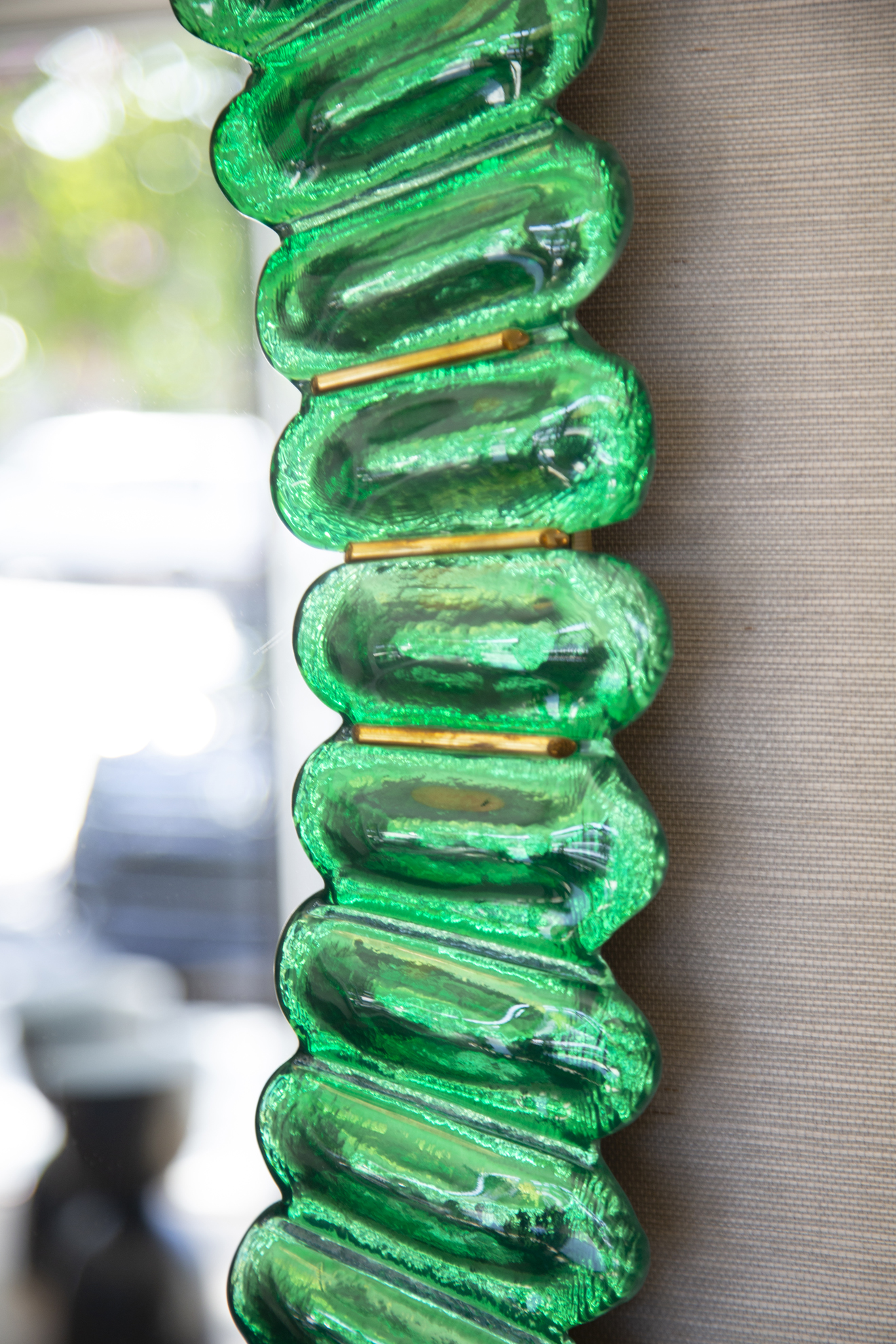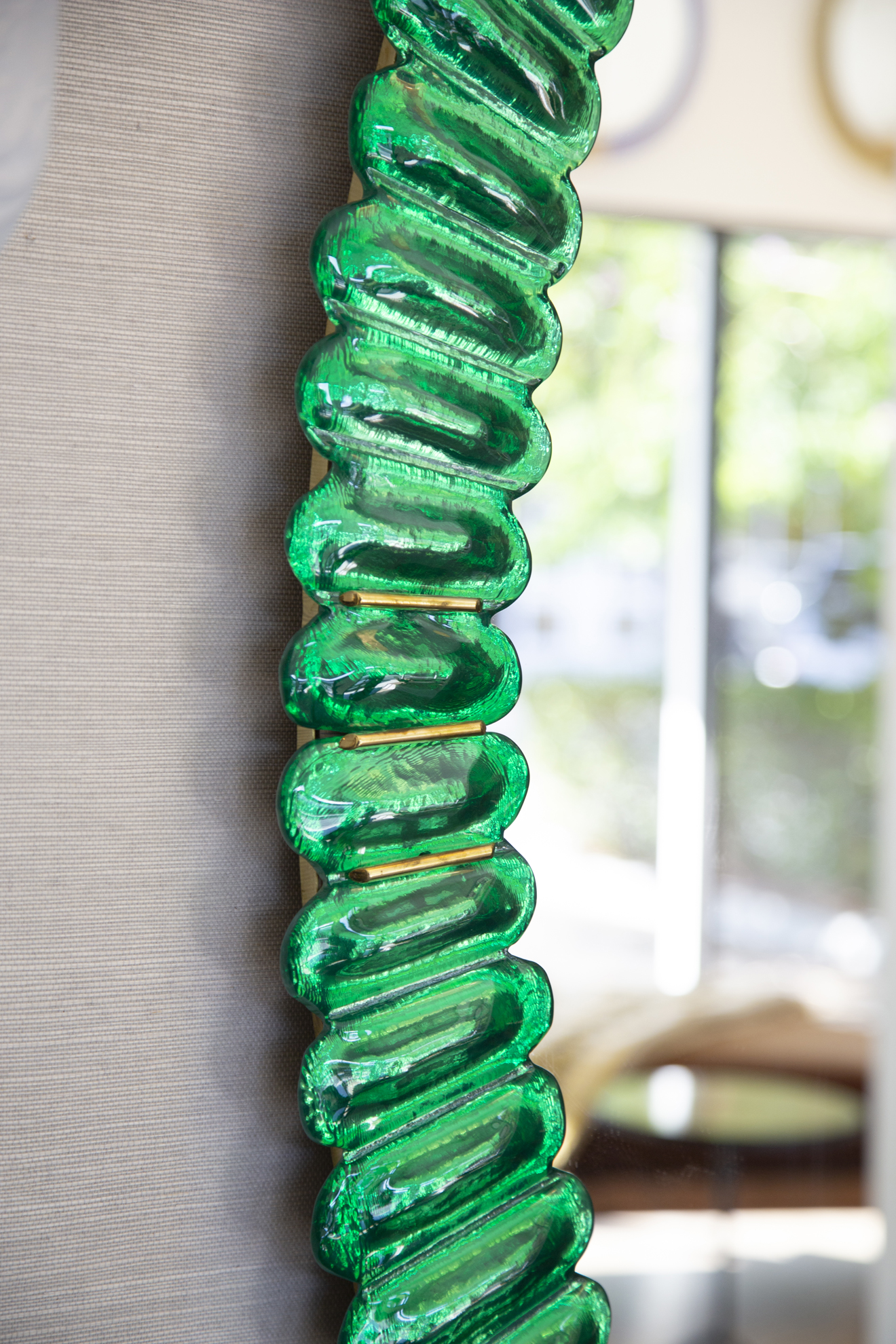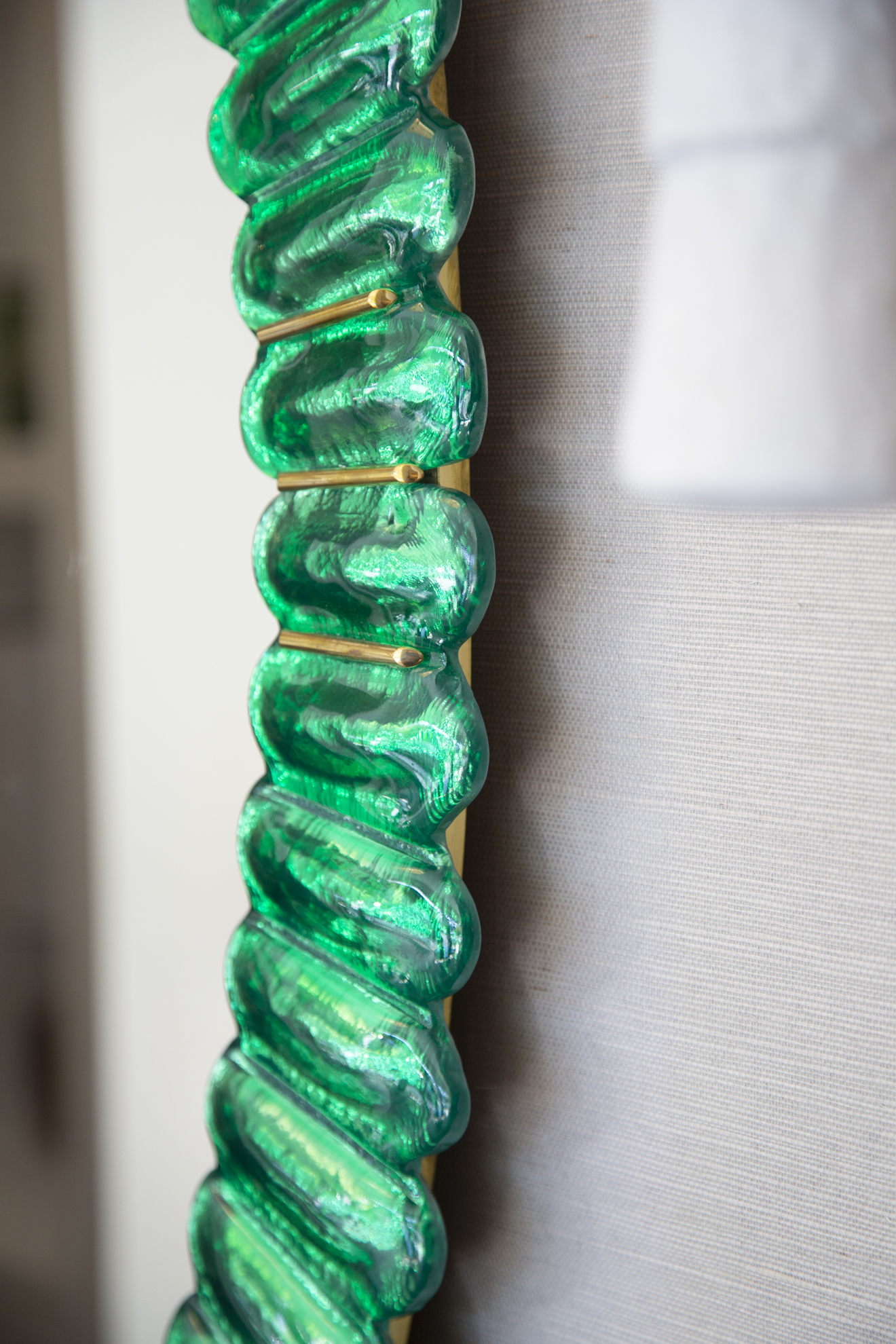 Contemporary and customizable oval mirror with a scalloped amethyst Murano glass frame and brass accents. Handcrafted by a team of artisans in Venice, Italy. Can be hung vertically or horizontally with metal bracket on back. Weight Lbs 37.