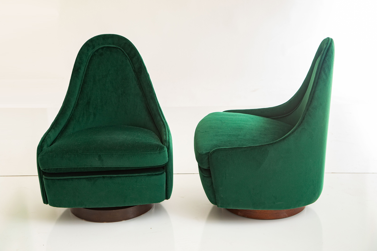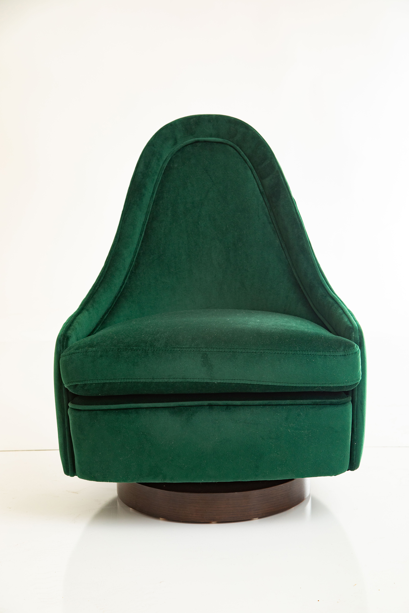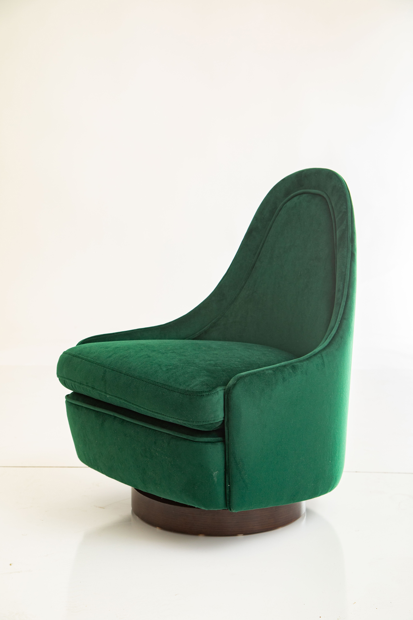 Pair of Mid-Century Modern petite tilt and swivel lounge chairs by Milo Baughman for Thayer Coggin Sculptural teardrop back on a walnut base Newly upholstered with an emerald green velvet.