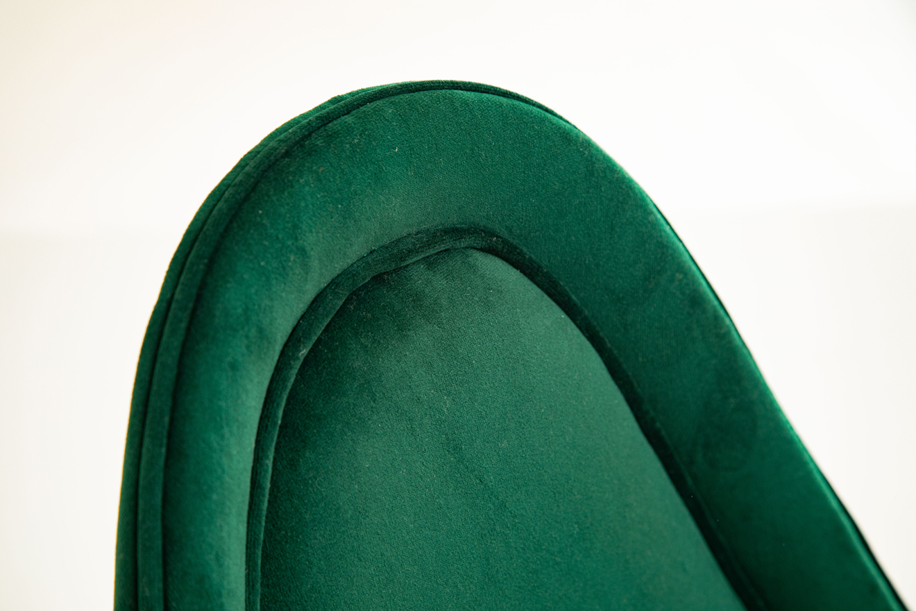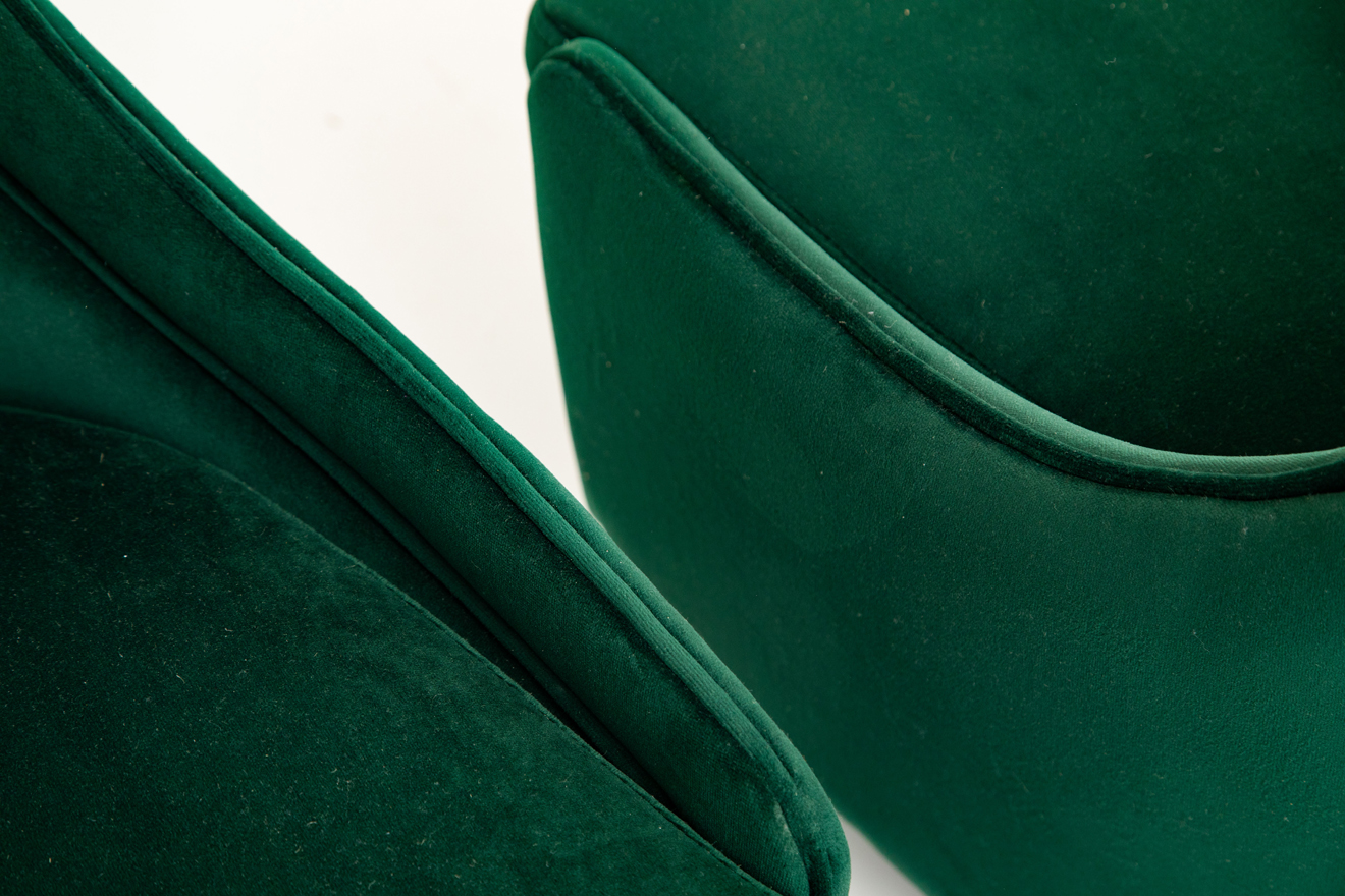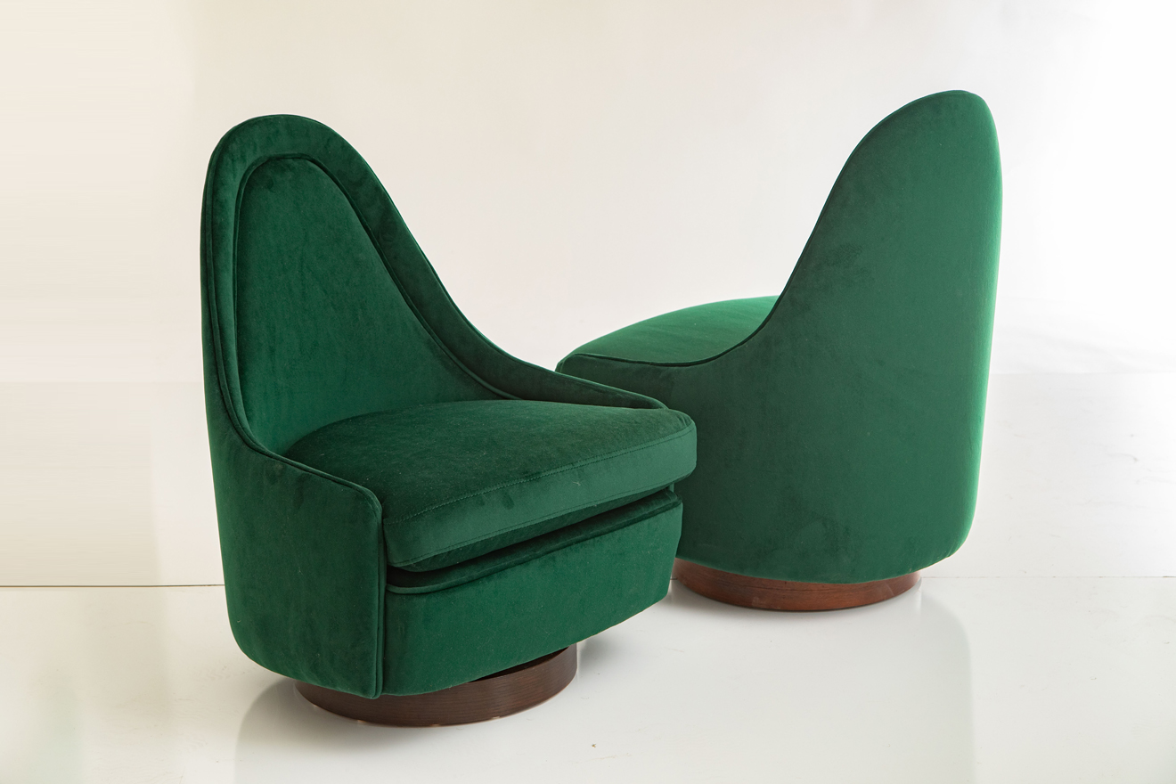 Pair of Mid-Century Modern petite tilt and swivel lounge chairs by Milo Baughman for Thayer Coggin Sculptural teardrop back on a walnut base Newly upholstered with an emerald green velvet.
