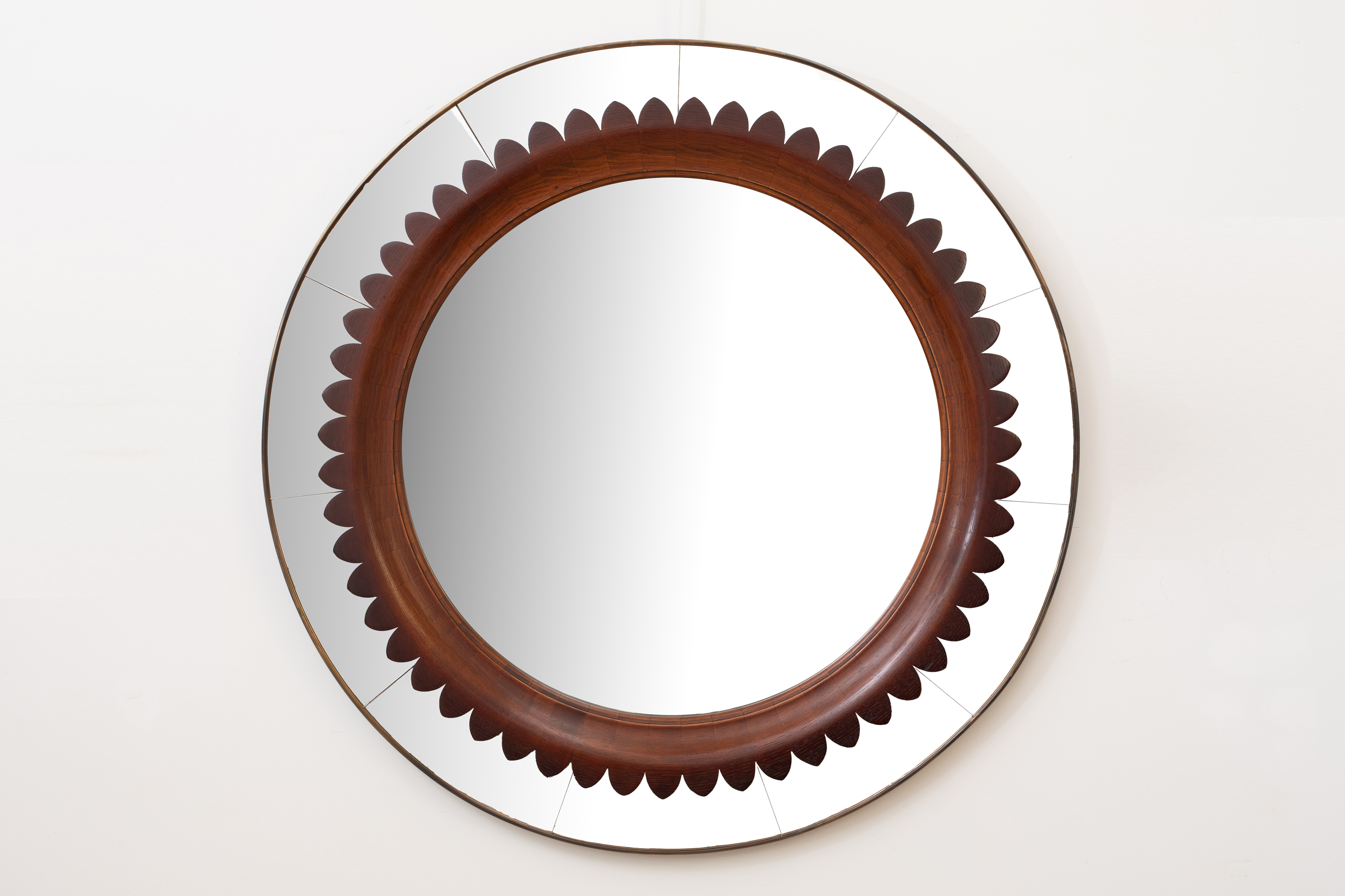 Mid-century modern round walnut and brass mirror by Fratelli Marelli,