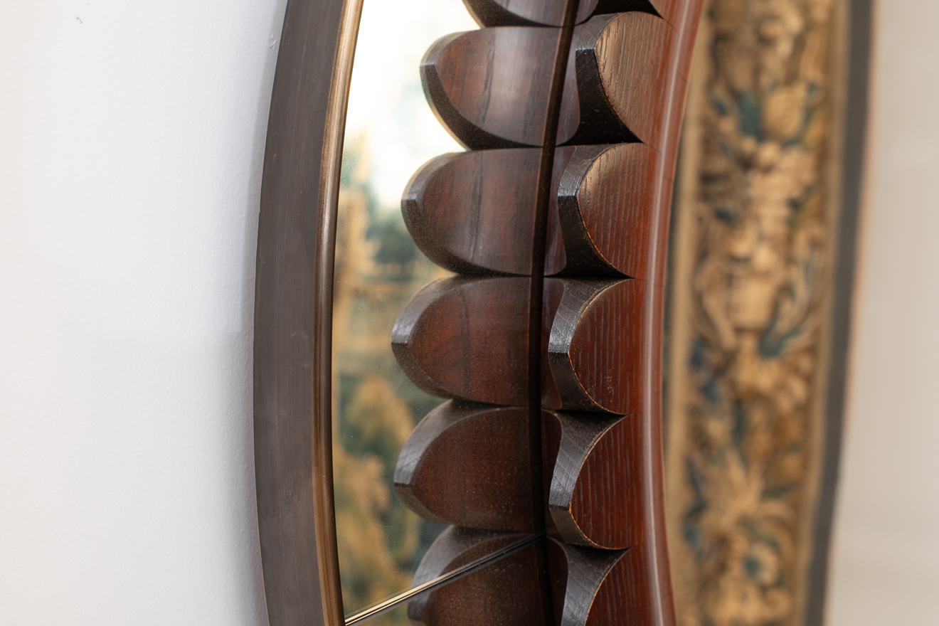Italy circa 1950. Rare circular mirror with carved scalloped inner accent and brass gallery. Pair available, priced individually