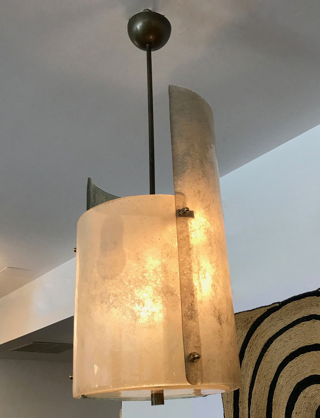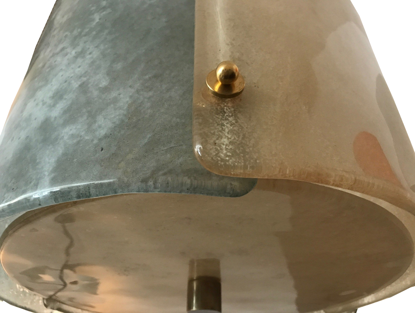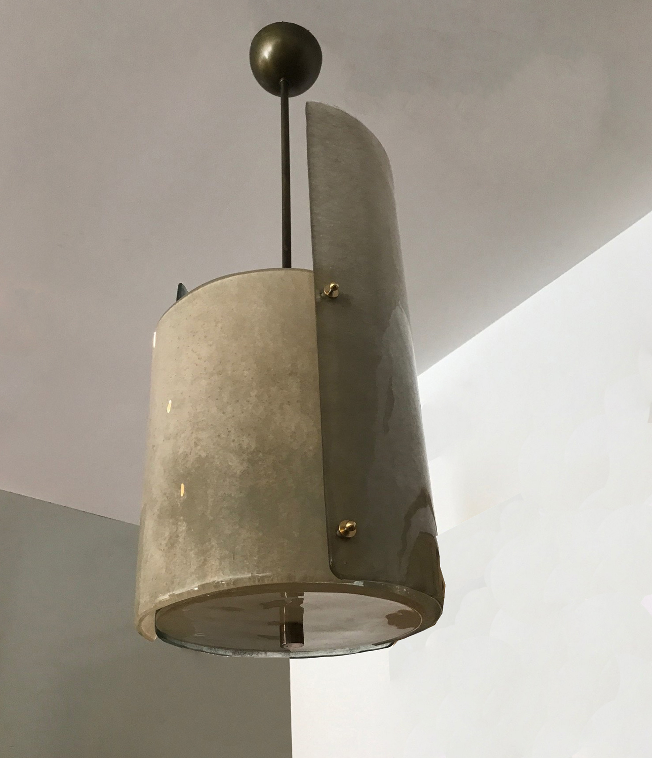 Three textured overlapping "scavo" glass forming a sculptural pendant or lantern. Patinated brass fittings, rewired to the US standard. Pair available, priced per piece.