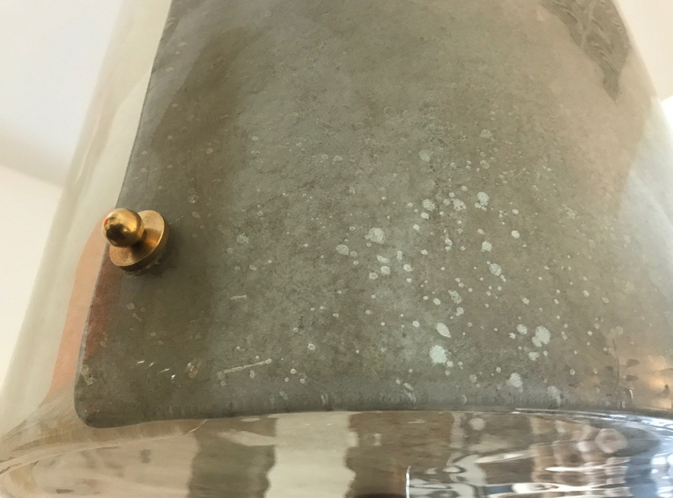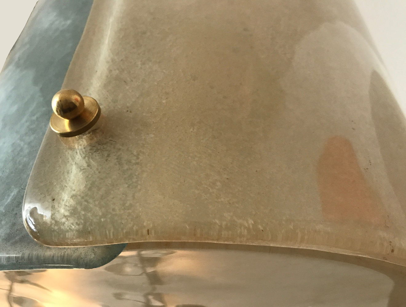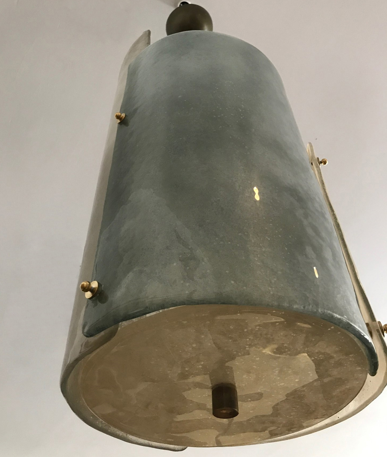 Three textured overlapping "scavo" glass forming a sculptural pendant or lantern. Patinated brass fittings, rewired to the US standard. Pair available, priced per piece.