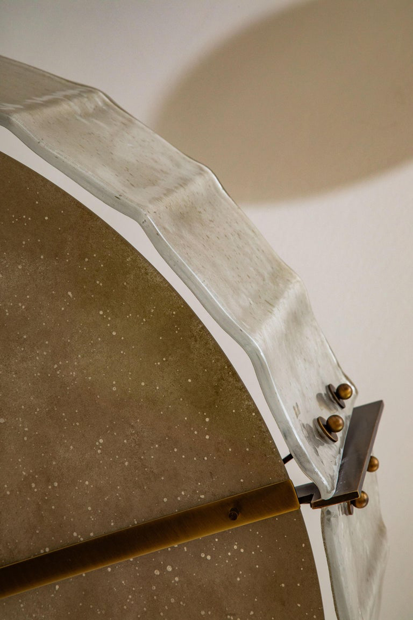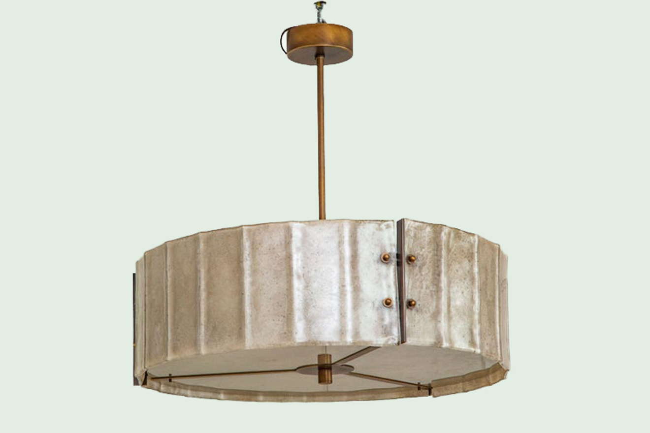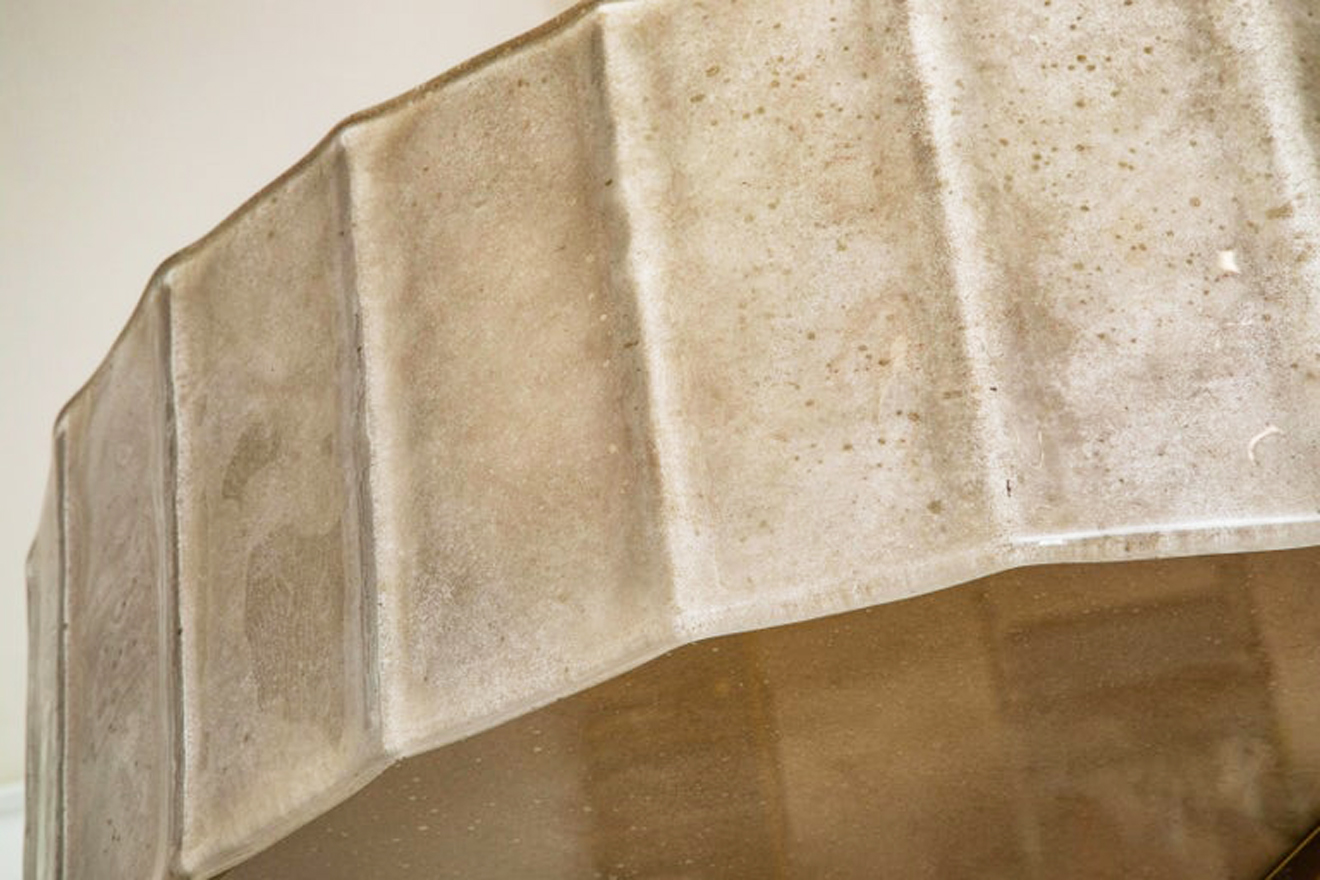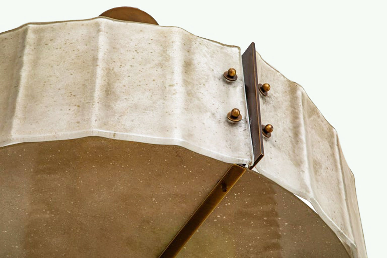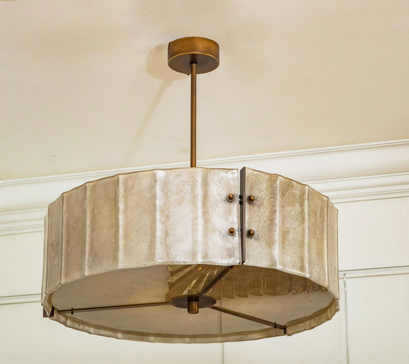 Three textured undulated and overlapping Murano glass forming a sculptural drum chandelier.