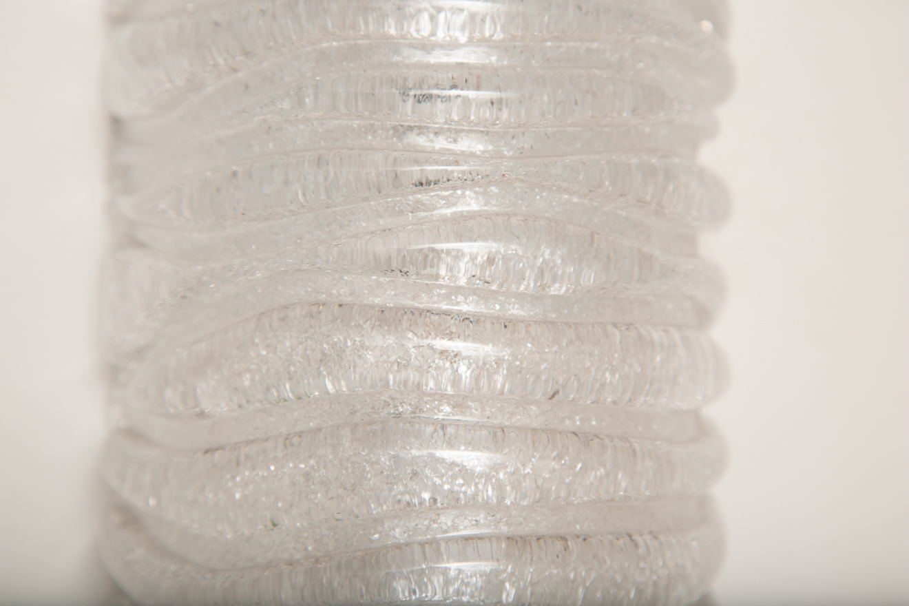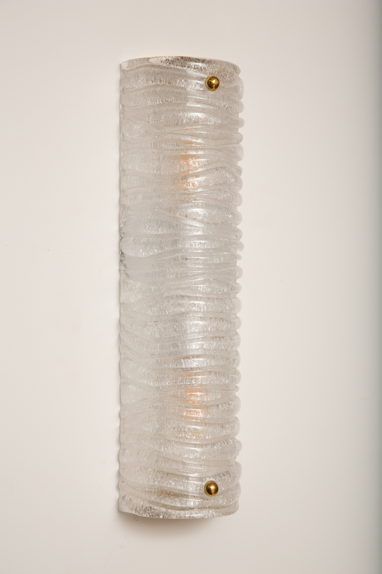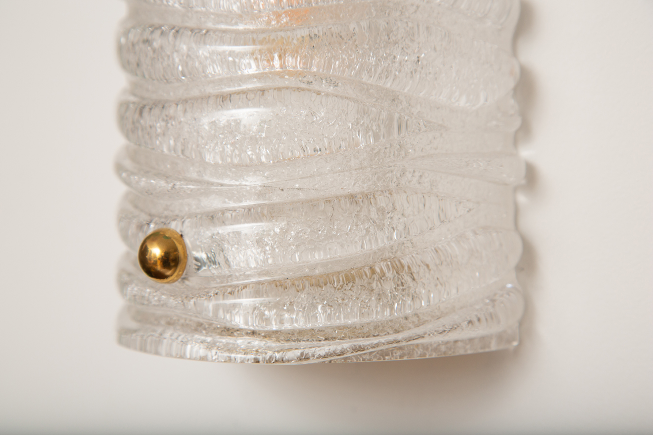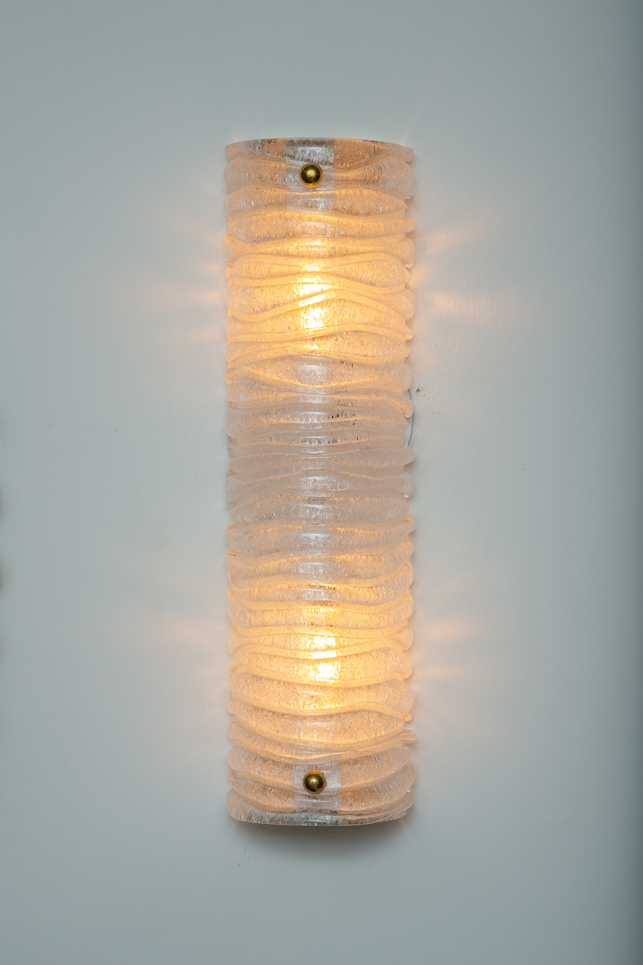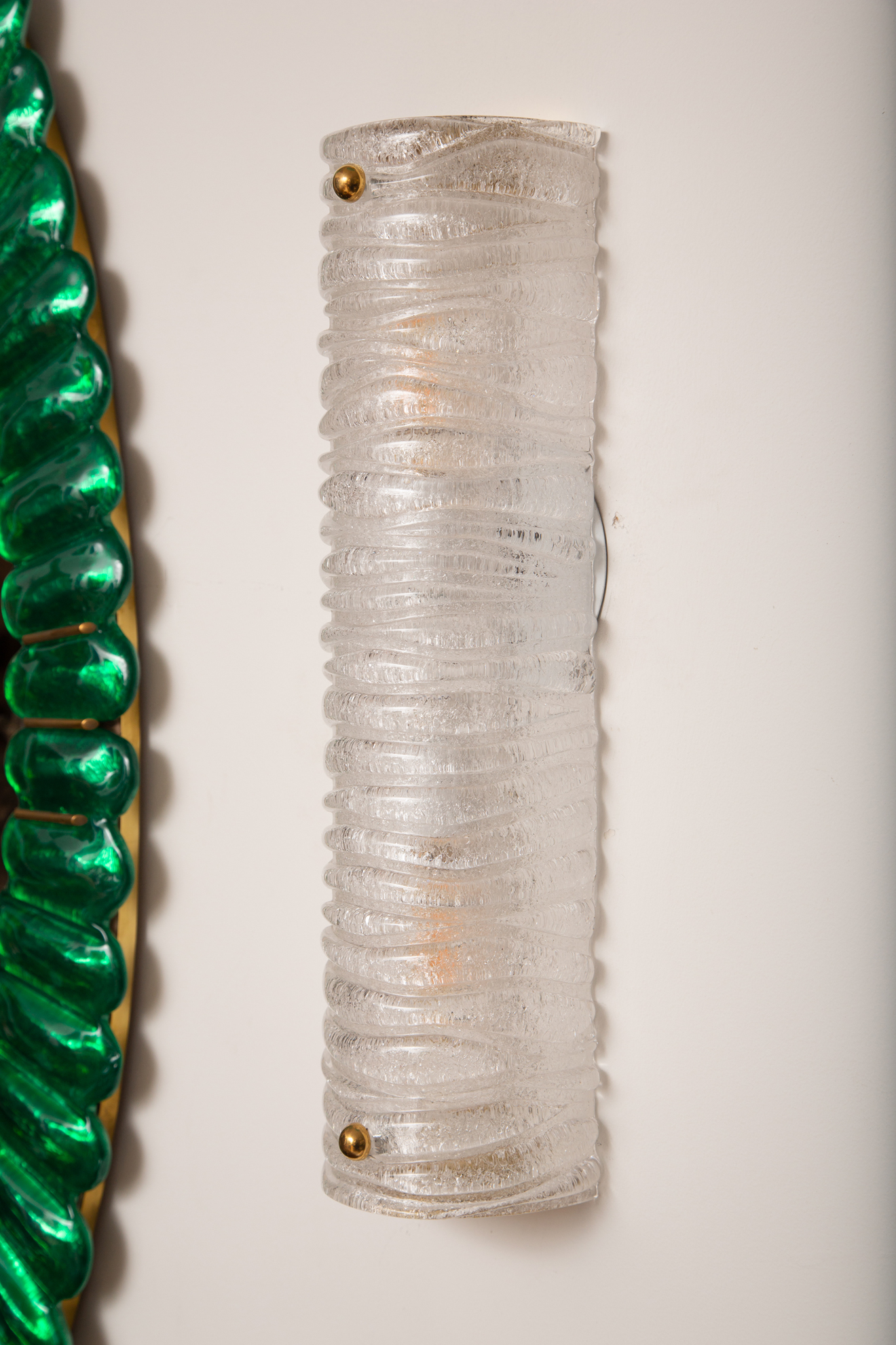 Pair of demi cylinder Murano graniglia white/clear glass wall sconces with brass fittings.