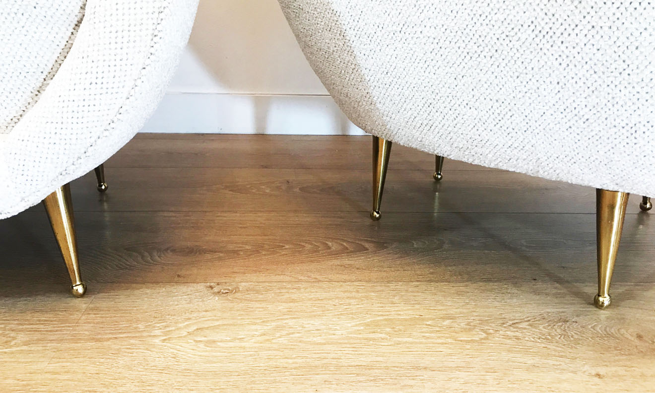 Newly upholstered curved shaped Italian lounge chairs. Heavy chenille and brass plated legs.