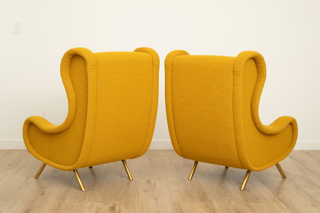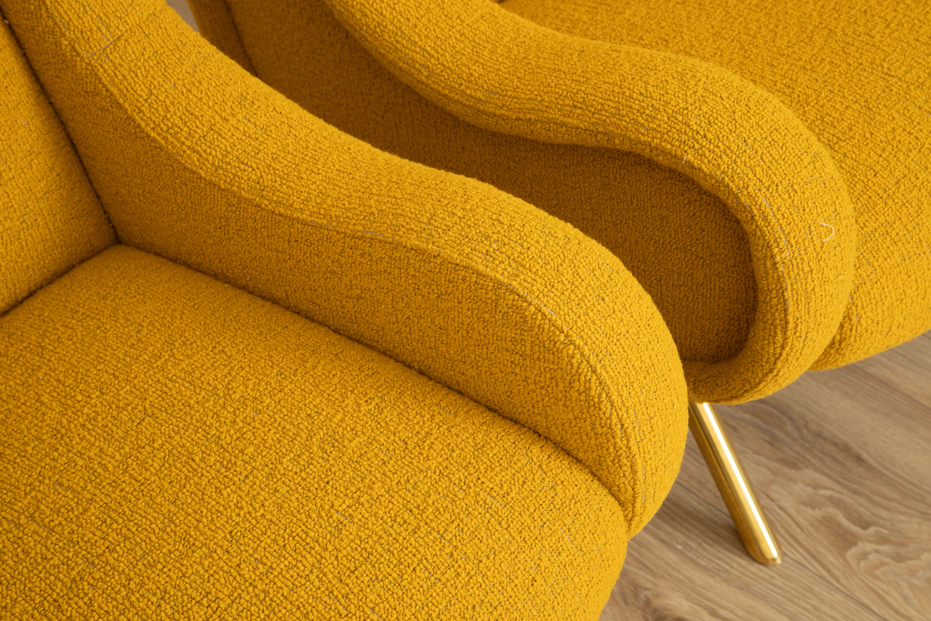 Newly upholstered with mustard boucle fabric and brass legs.