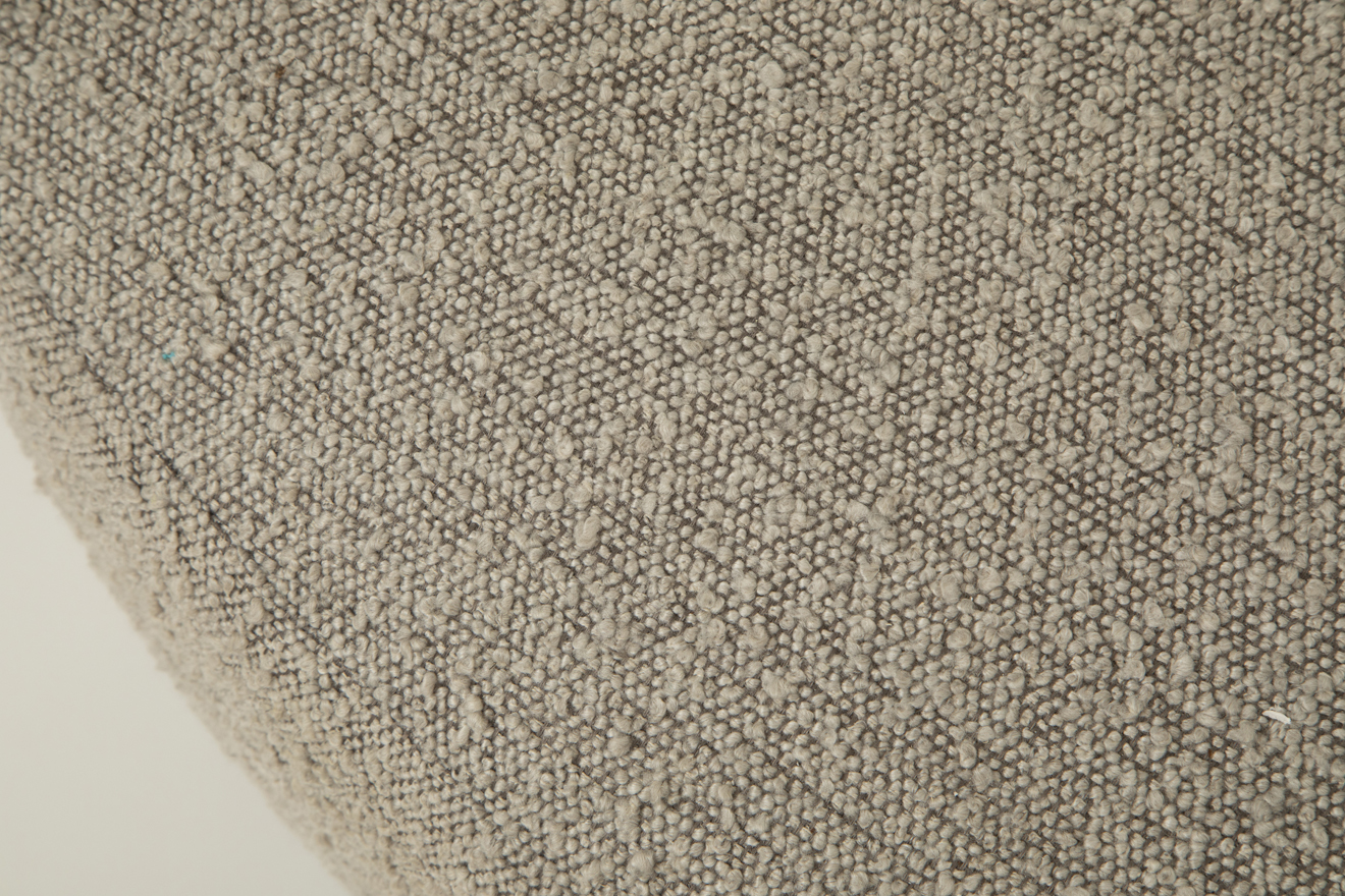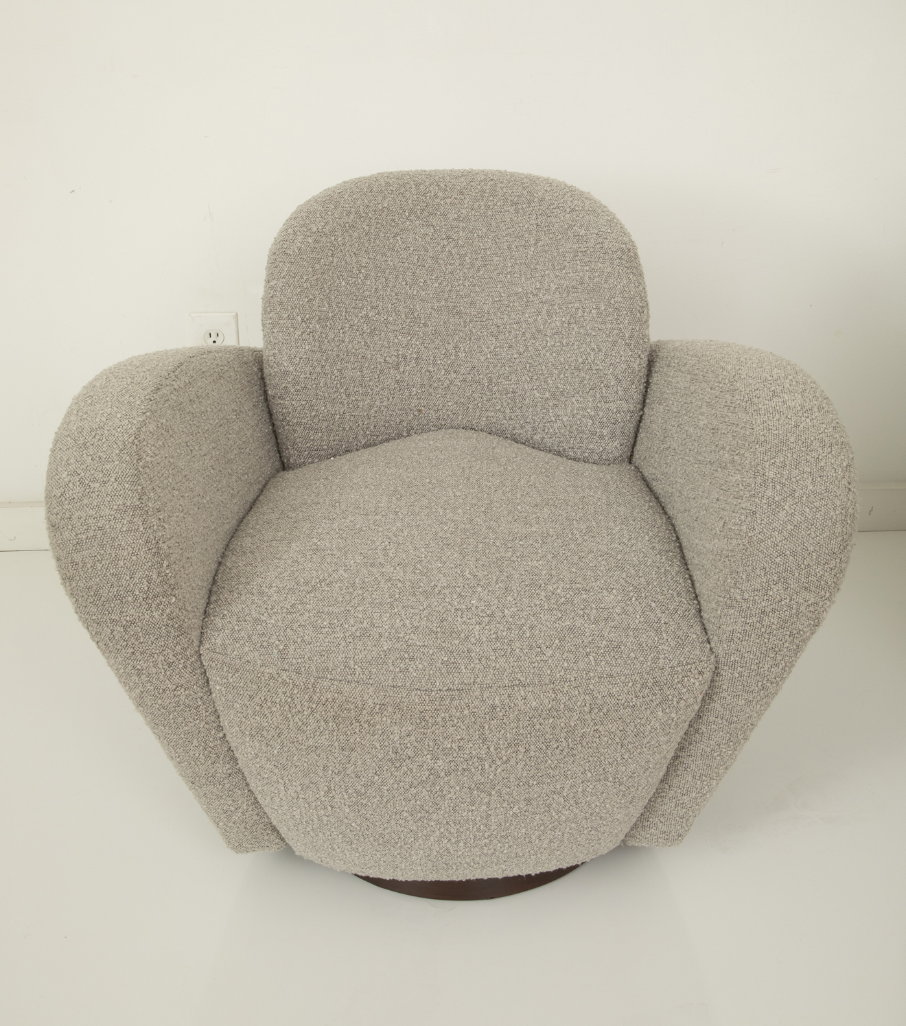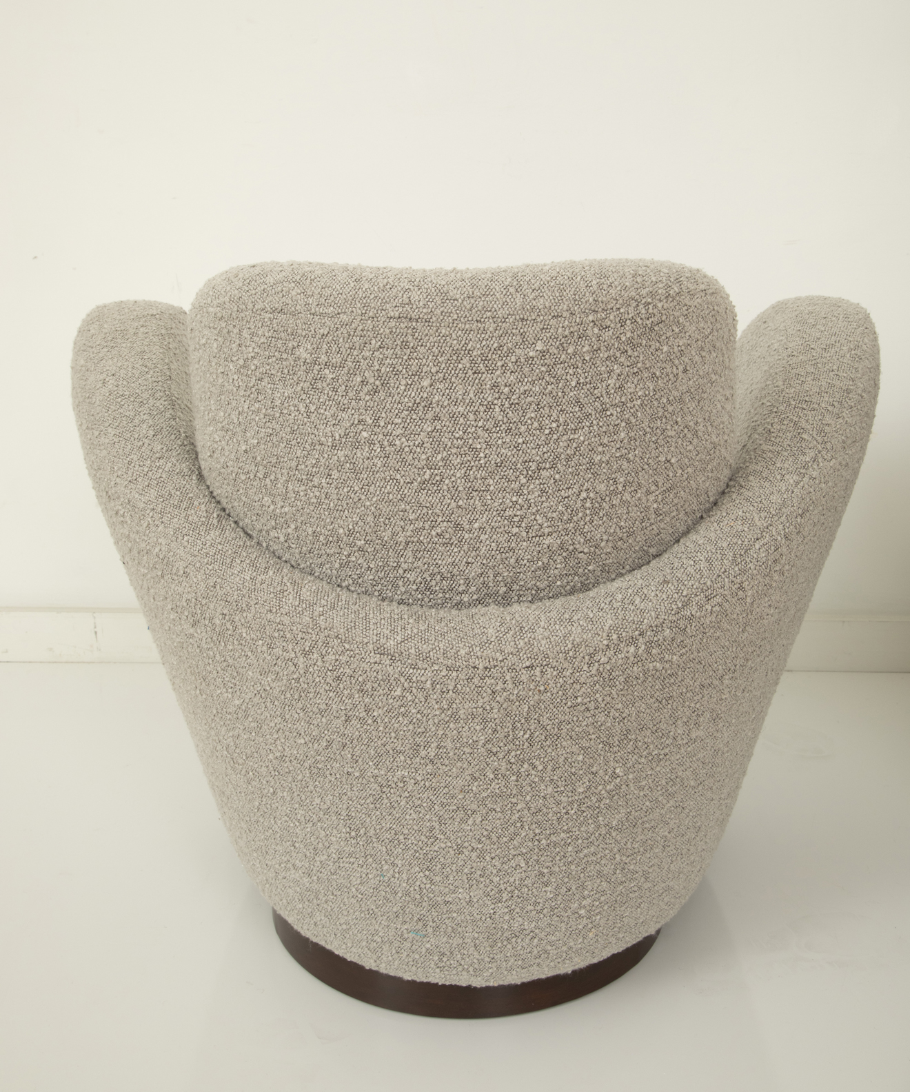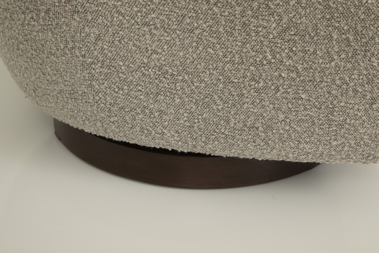 Newly upholstered with a curly boucle and refinished wood base.