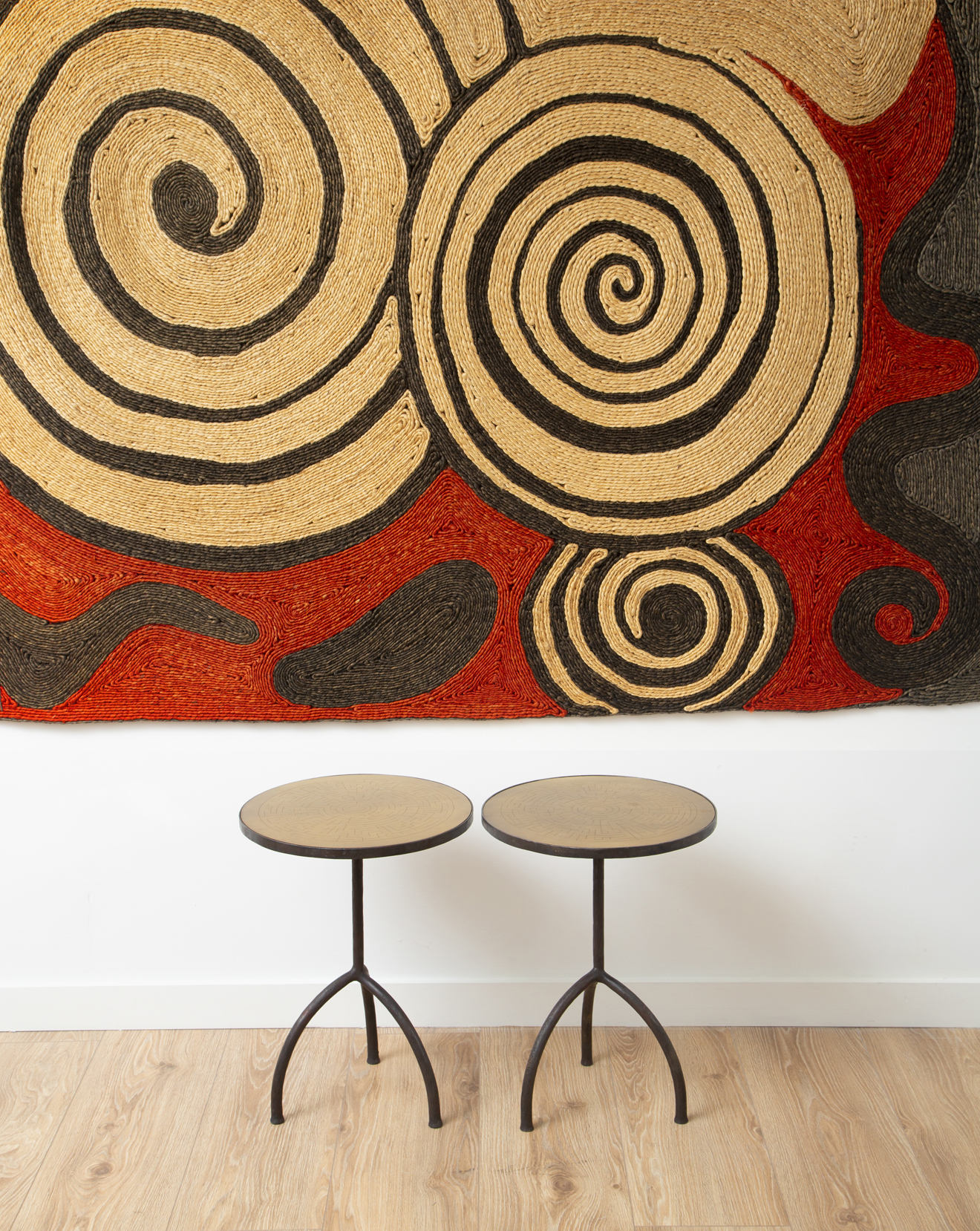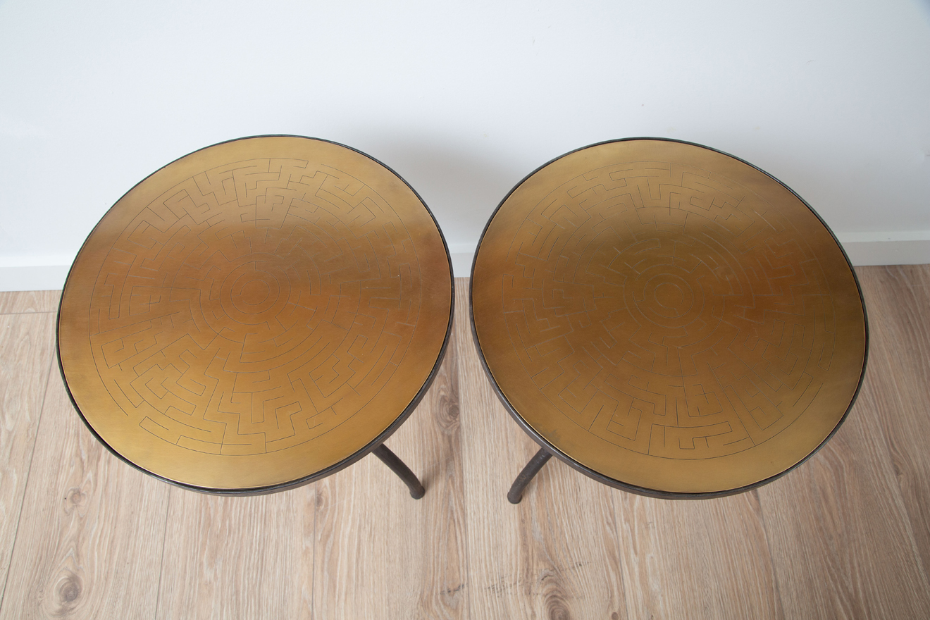 Pair of Wrought Iron With Etched Brass Top Side Tables