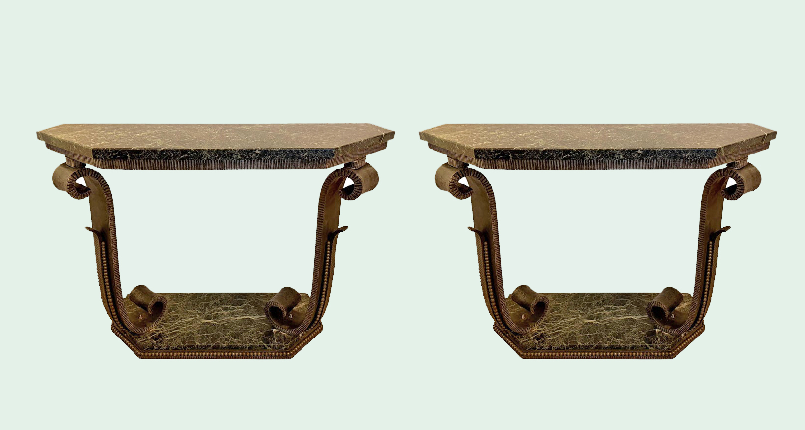 Pair of French  Art Deco  Wrought Iron & Marble Consoles