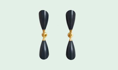 Pair of black enameled tole wall sconces with brass fittings. Up and down light.