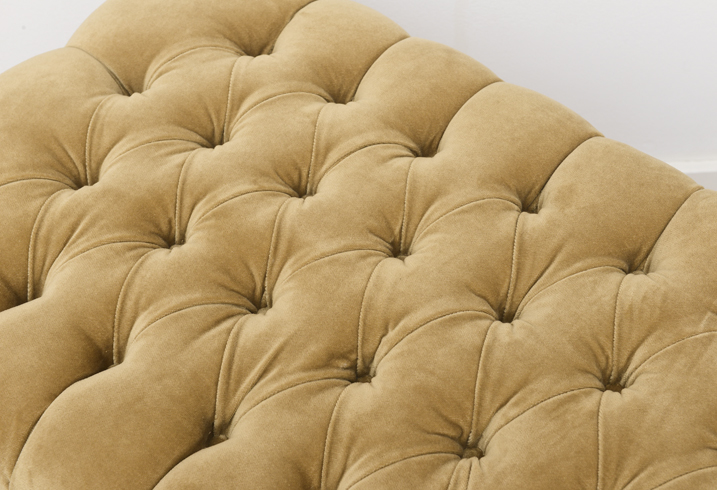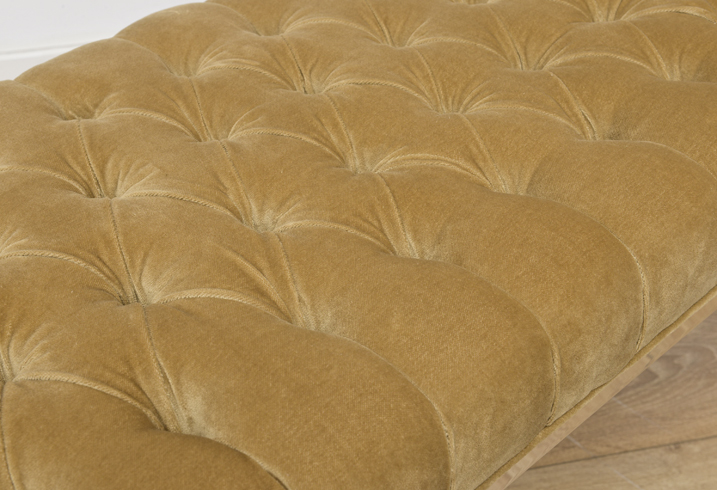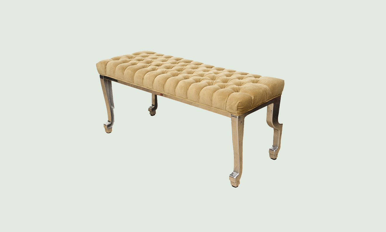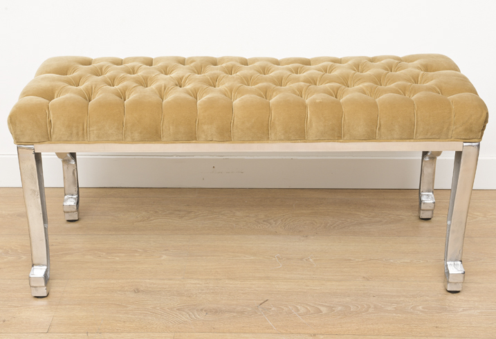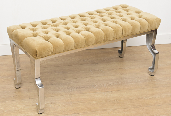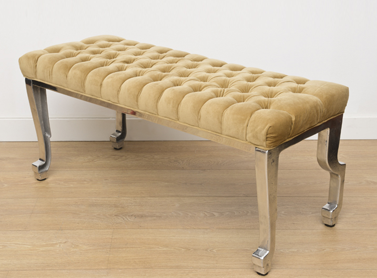 Etruscan style, animal form base in polished aluminum bench, upholstered with a caramel tufted velvet.42″ W x 18″ D x 20″ H