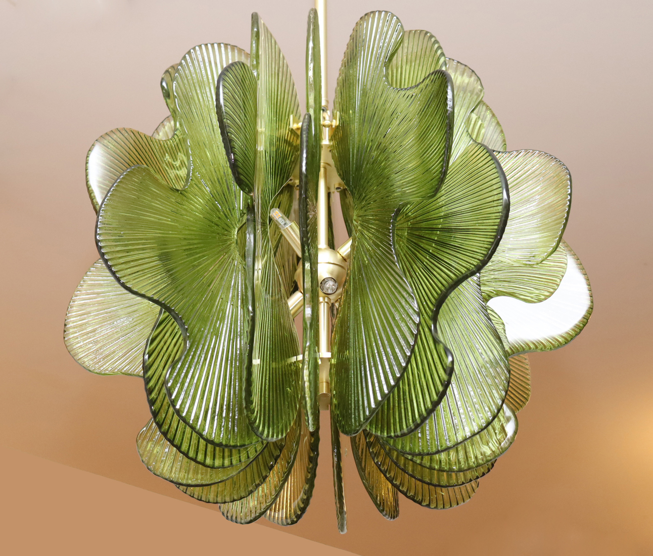 Modern green textured glass chandelier . Multiple vertical layers with wavy cuts give a fresh and vibrant look.