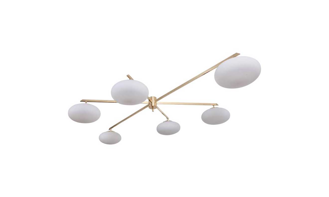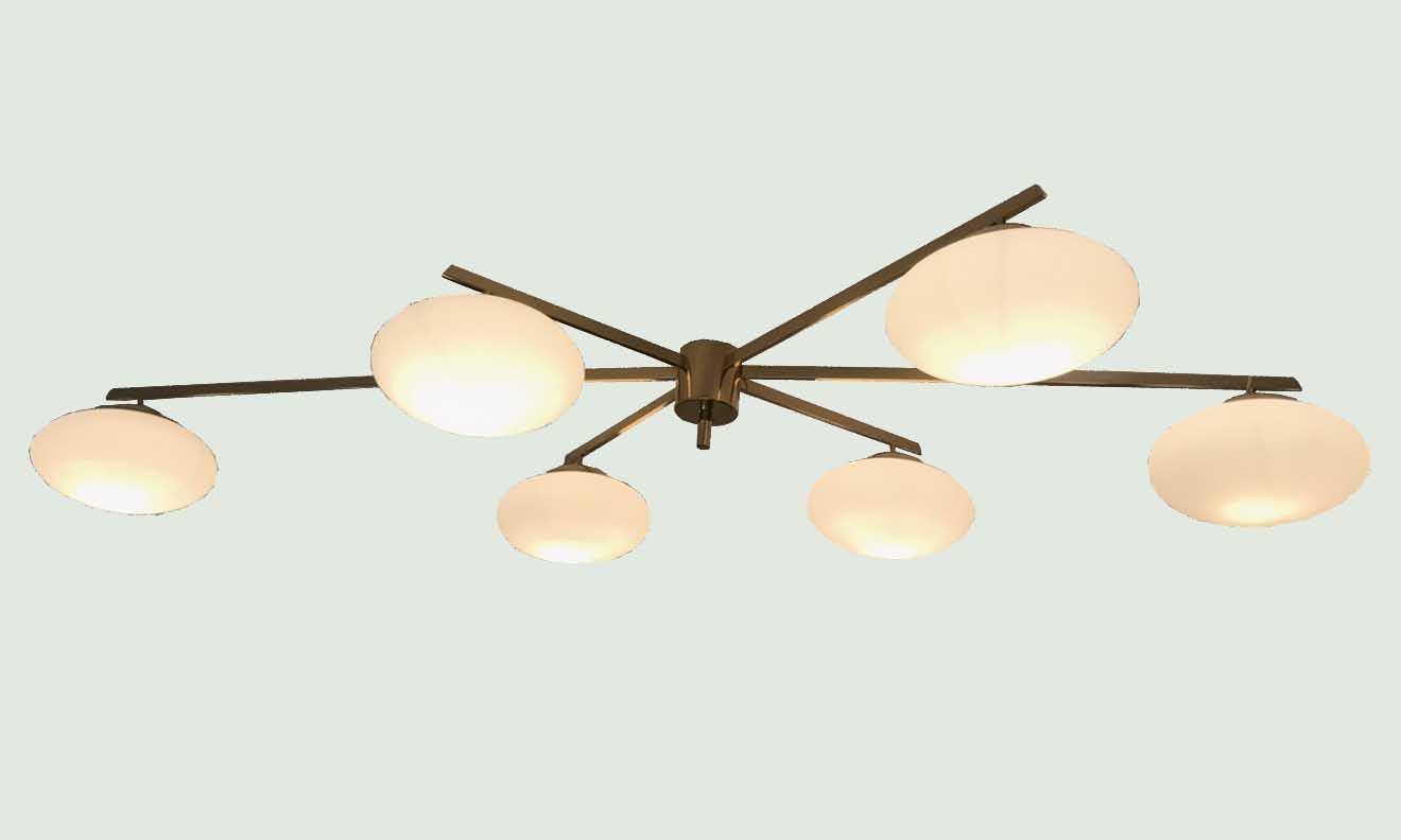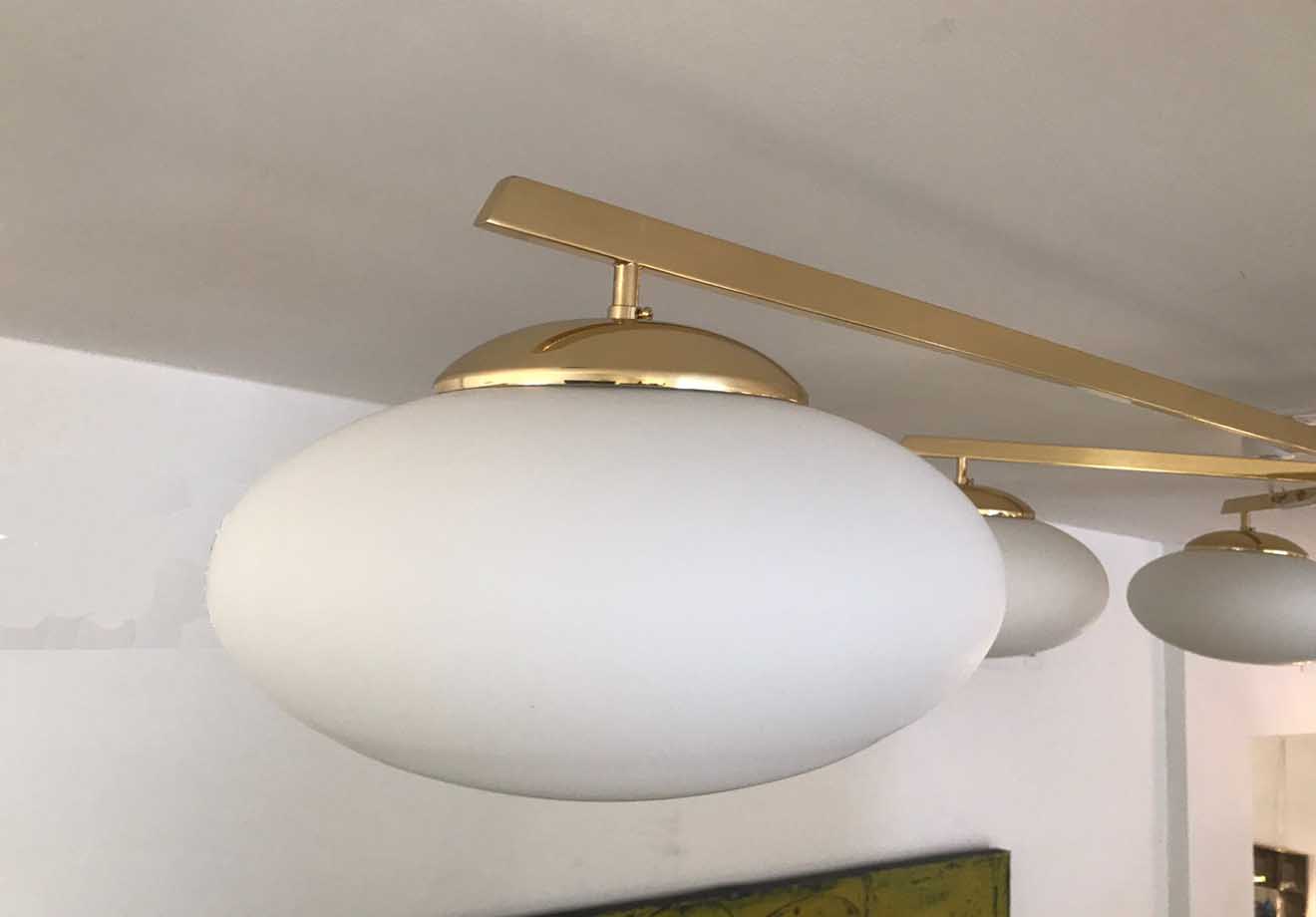 After Angelo Lelli design, brass and 6 oblong shape matte globes flush mount chandelier.