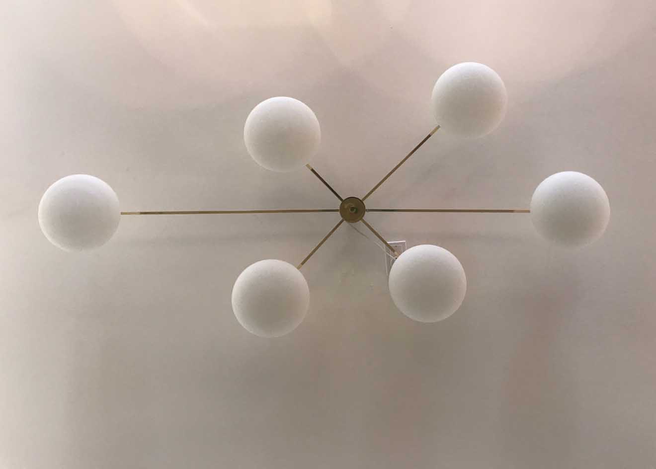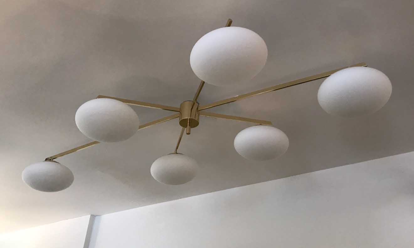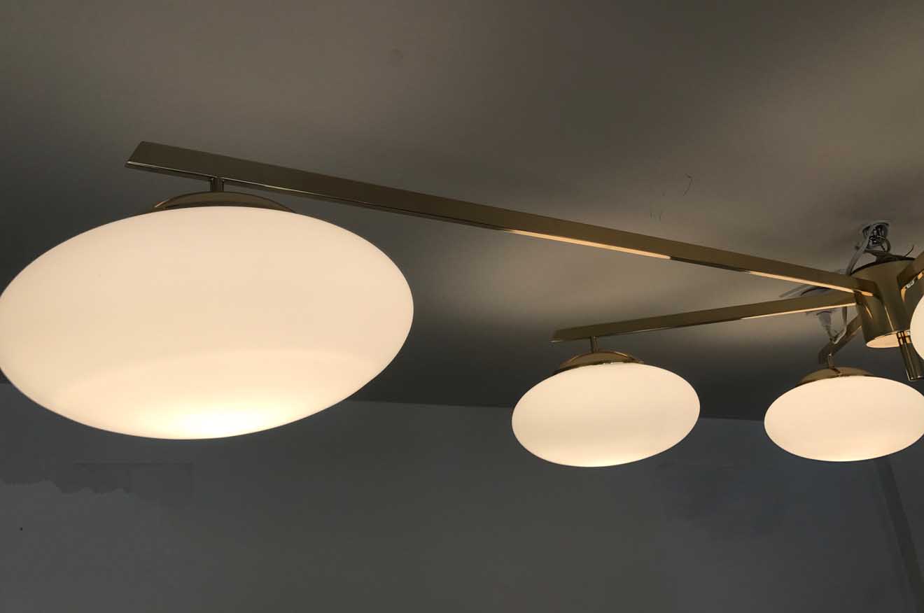After Angelo Lelli design, brass and 6 oblong shape matte globes flush mount chandelier.