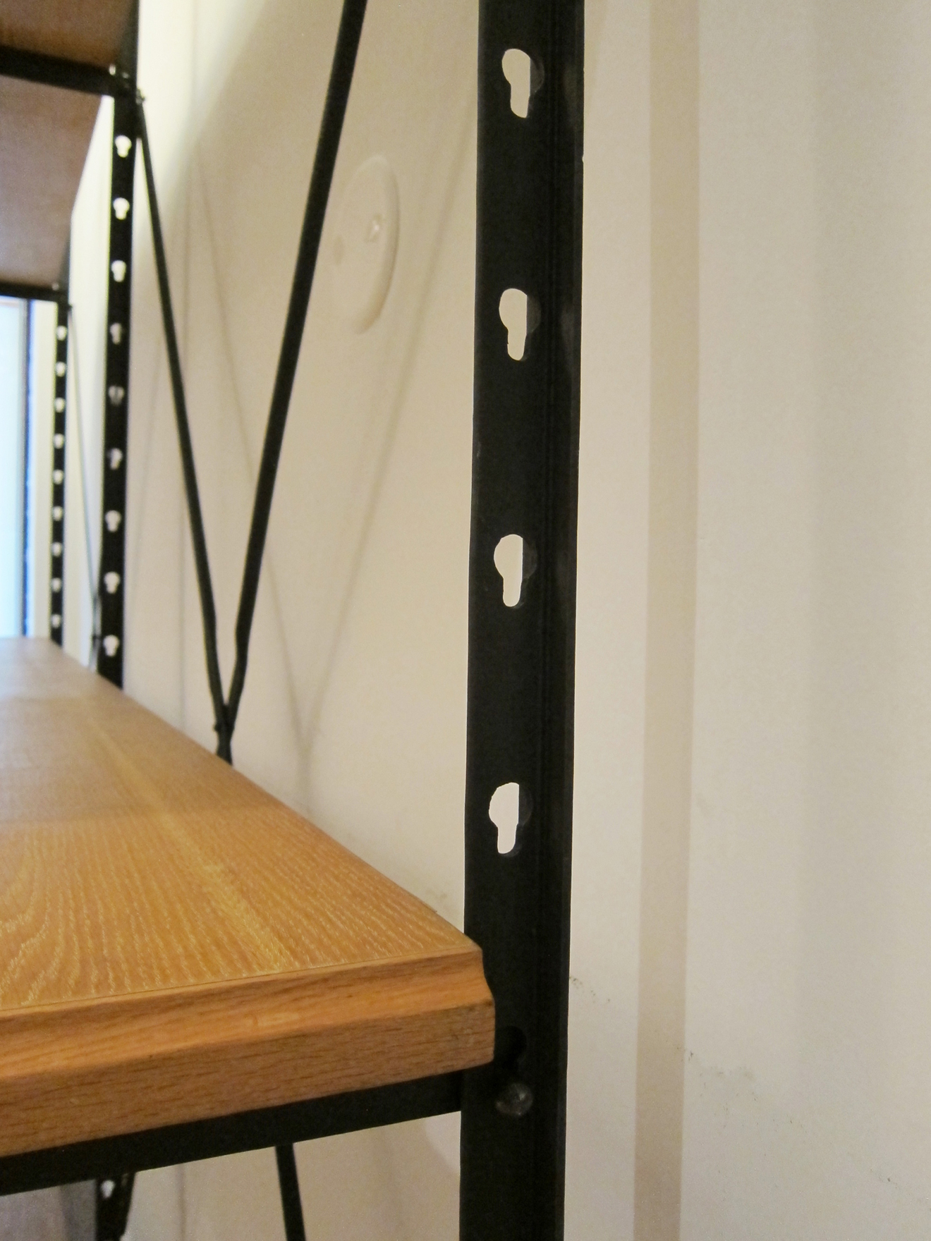Large and deep 20th century French industrial store display fixture or shelving unit, etagere, library Iron mounted frame with X-shaped back supports Oil-rubbed hand polished finish, Four newly made removable and adjustable natural stained oak shelves, (showing three in the picture) Metal tag on center post: Th. Scherf Paris A versatile shelving unit to store and display objects, fit inside both residential and commercial interiors. Because of the weight and scale this item will ship dismantled and must be assembled. Each shelf measures 97"1/4 width, 27'1/2 diameter, 1"/12 thick.