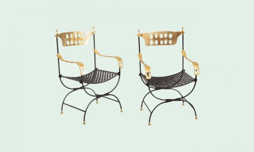 Pair of bronze and iron Dante curule armchairs, by David Marshall