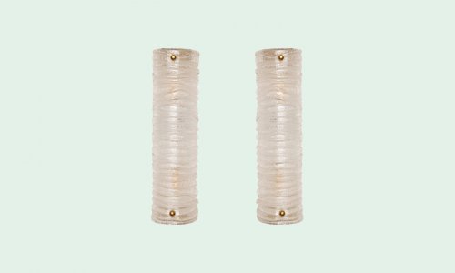 Pair of demi cylinder Murano graniglia white/clear glass wall sconces with brass fittings.