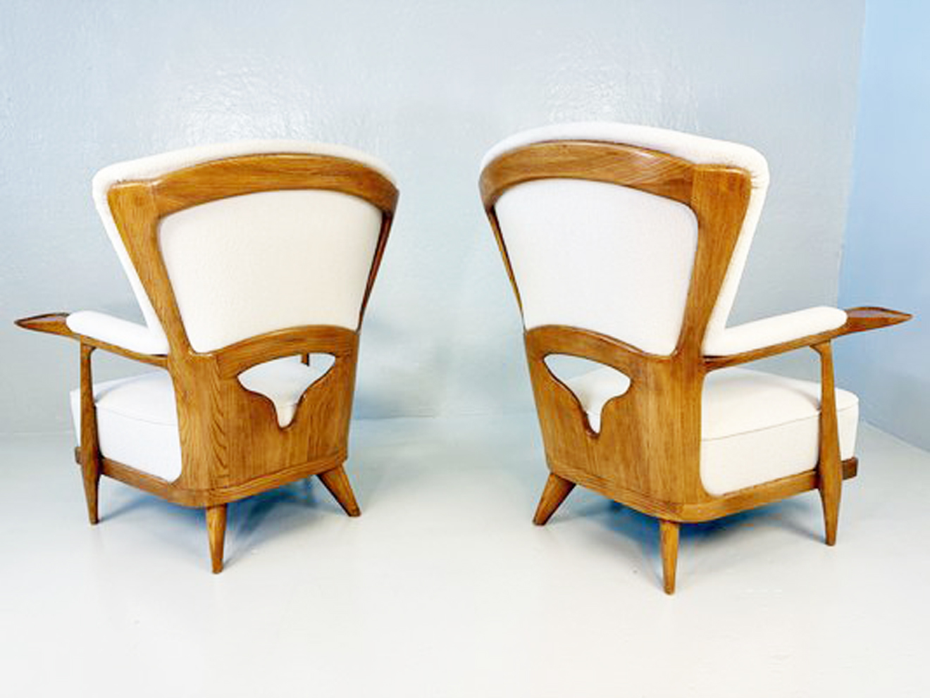 Pair of Italian walnut and ivory fabric lounge chairs.