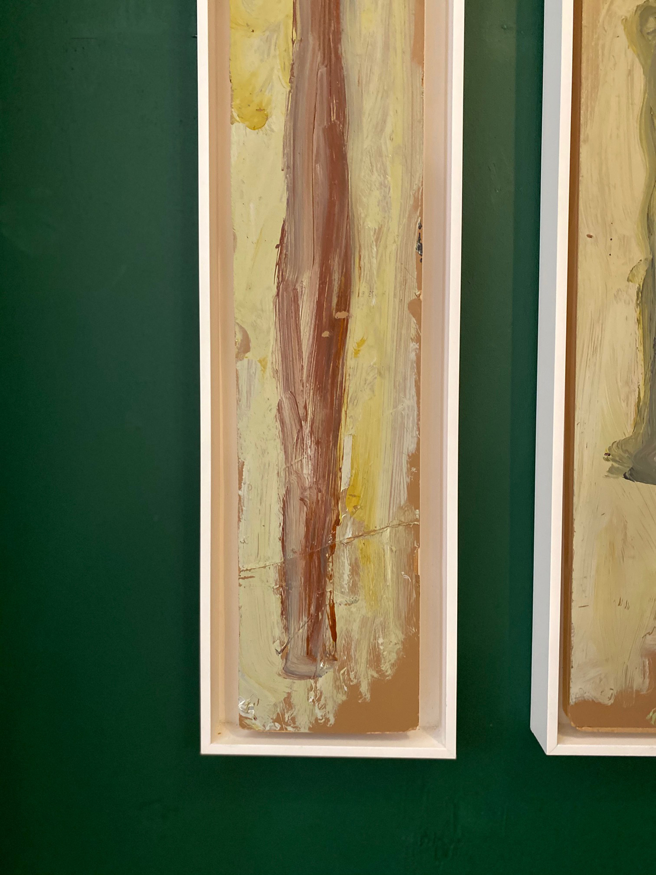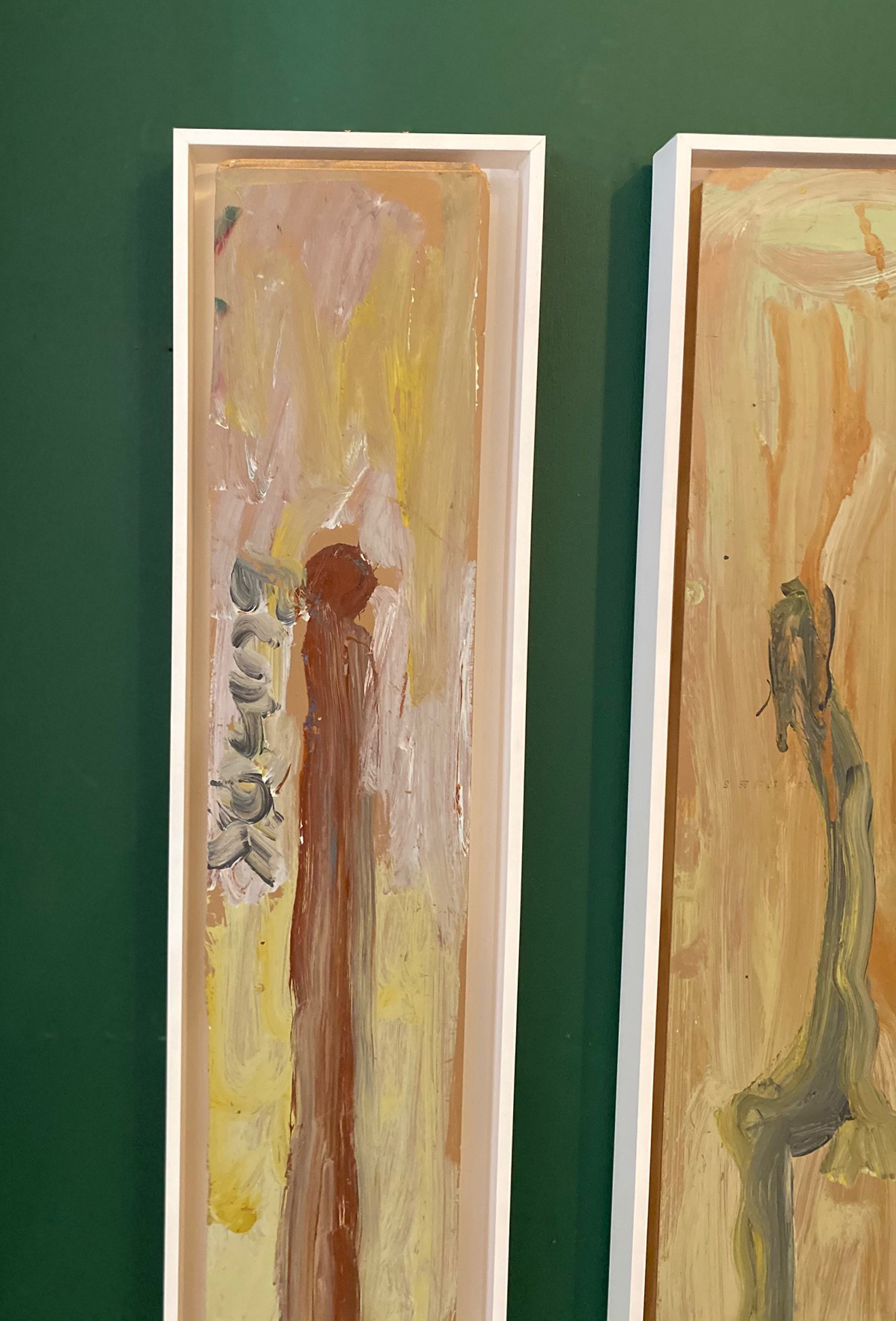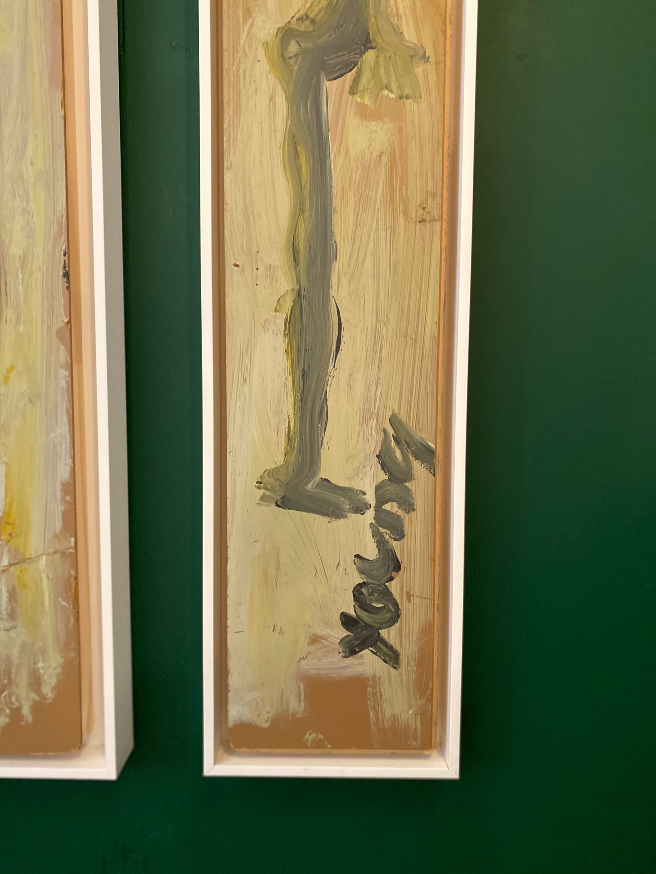 Pair of Purvis Young male and female paintings on reclaimed laminate wood floor tile.