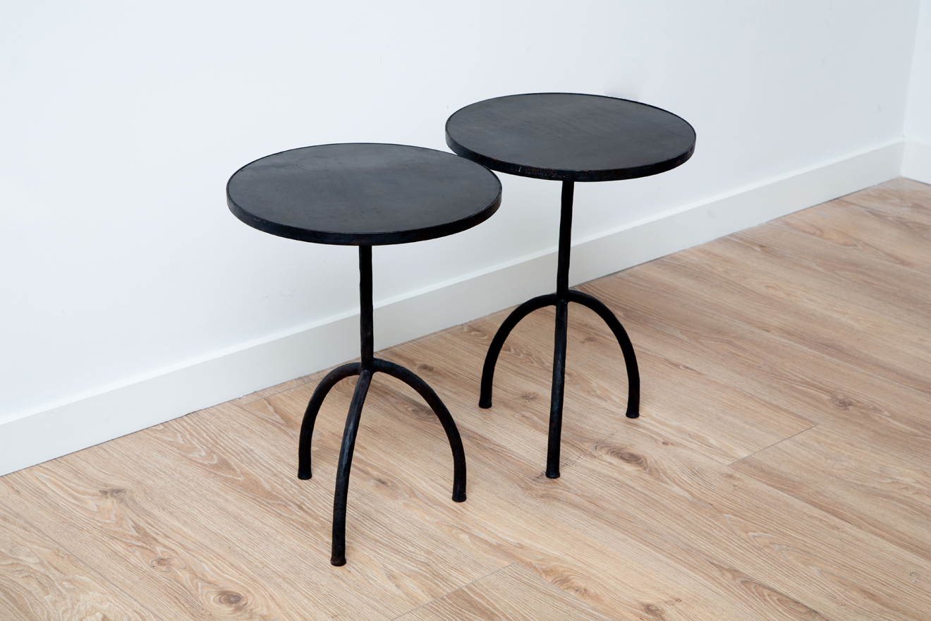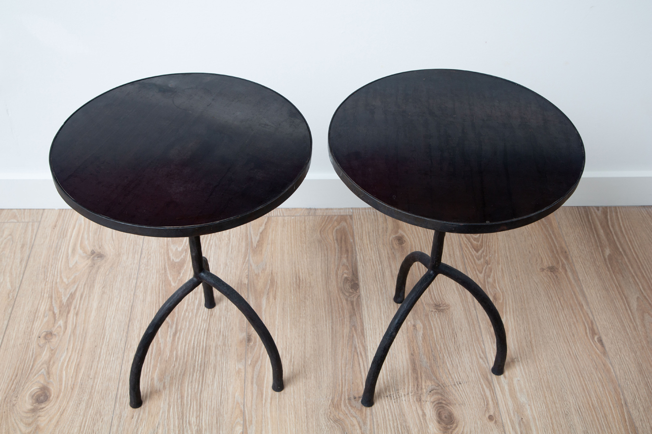 Black patina wrought iron side tables with black patina metal top.