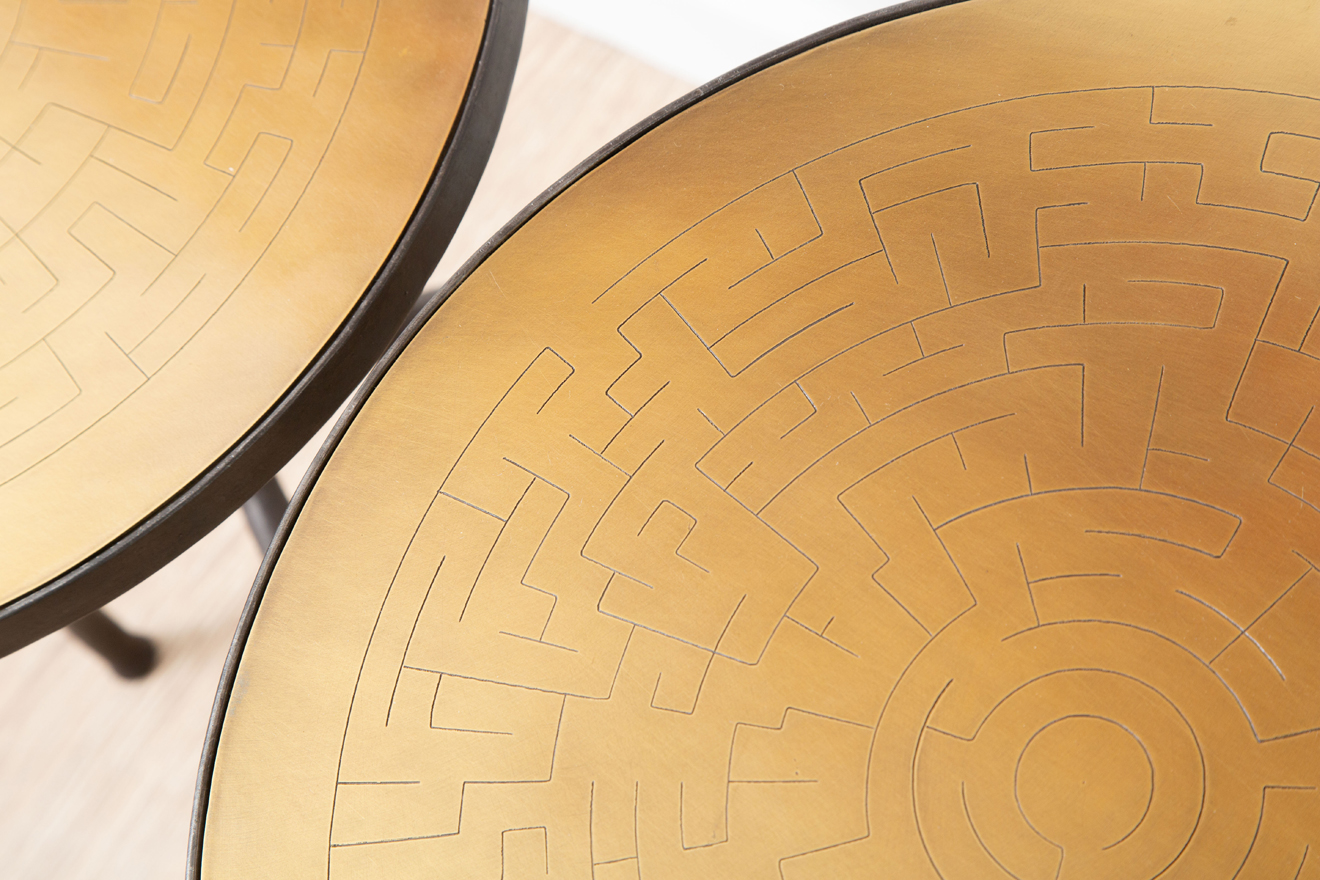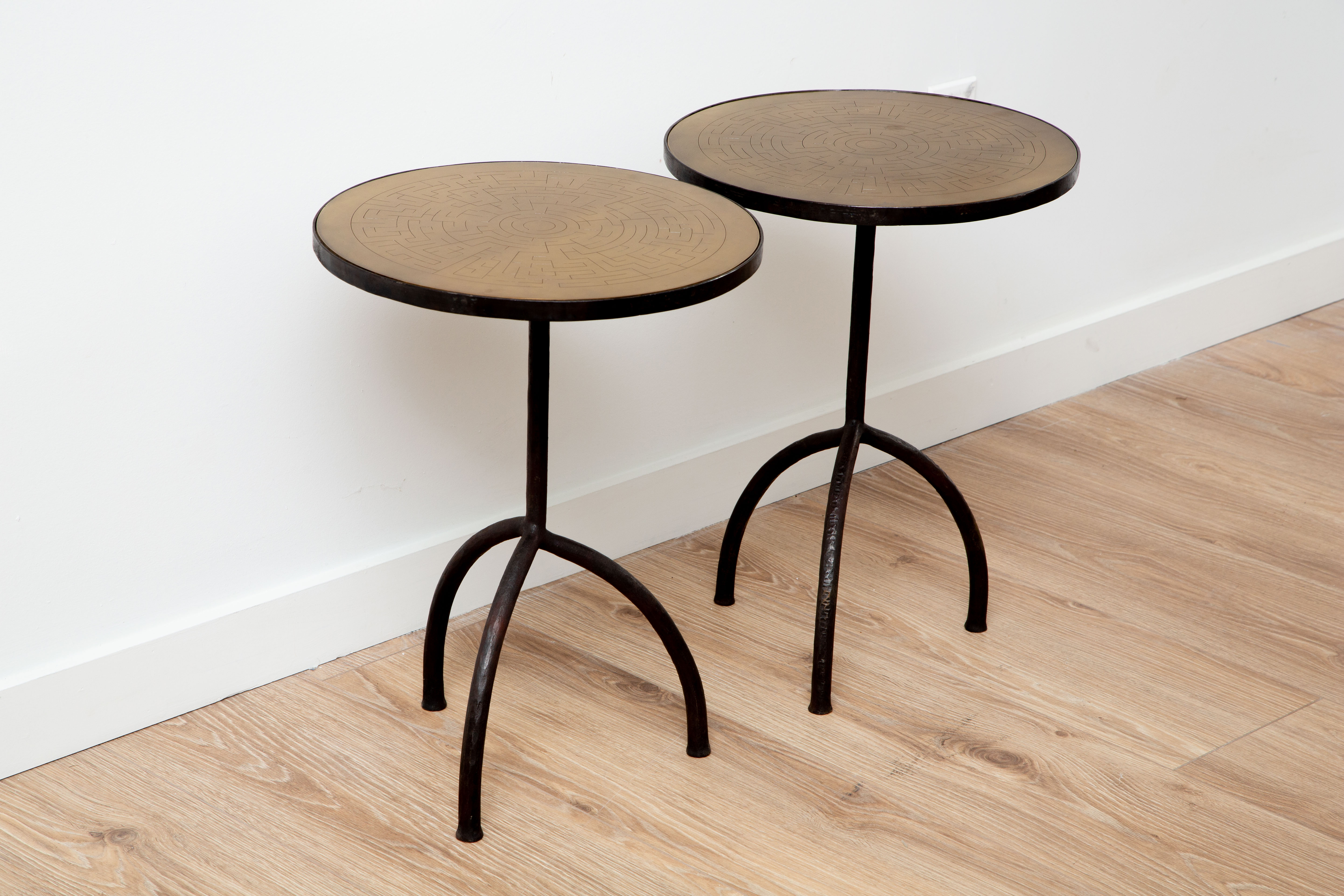 Pair of Wrought Iron With Etched Brass Top Side Tables
