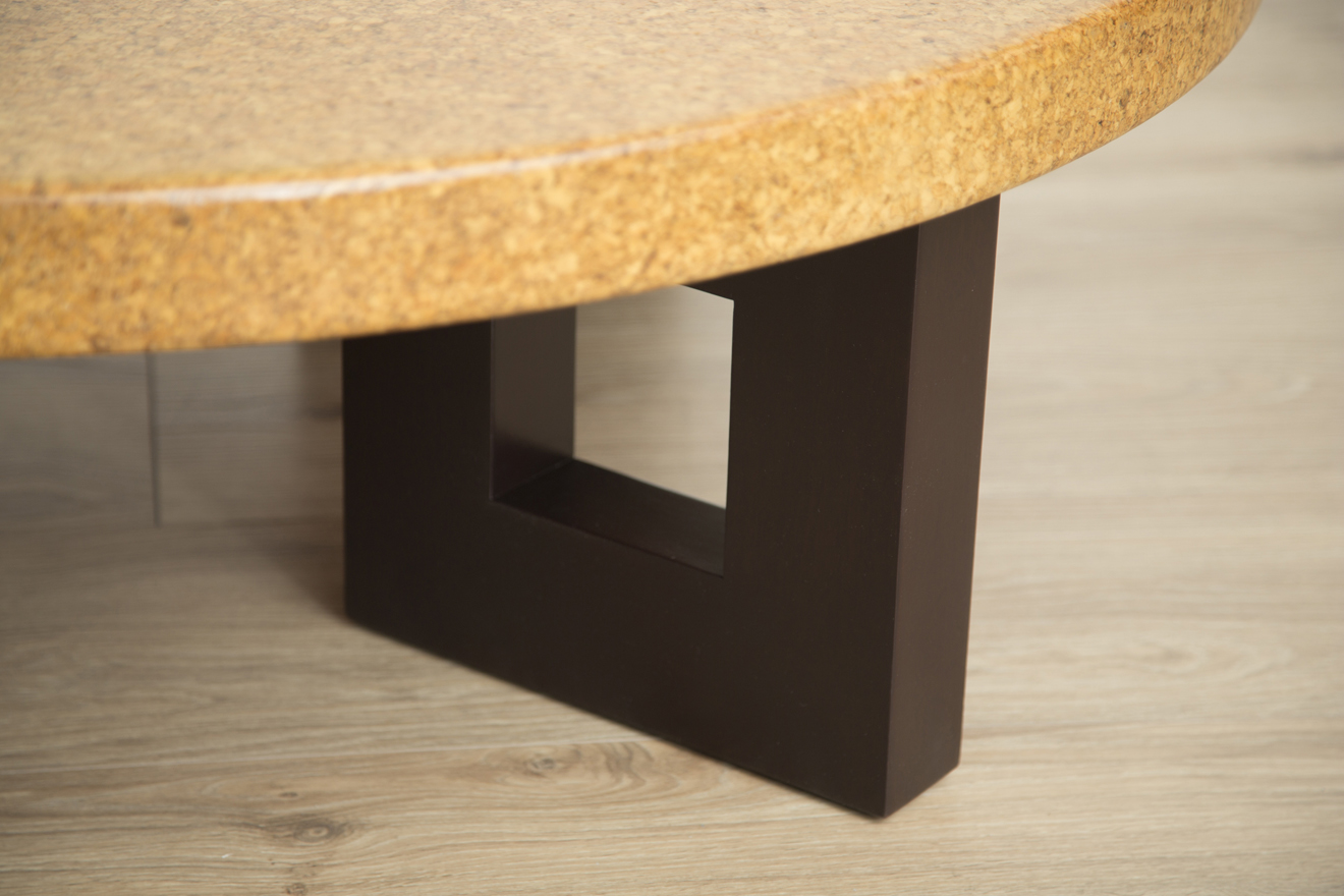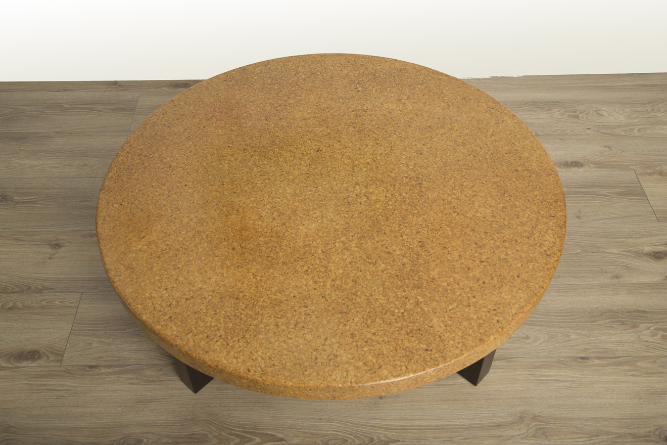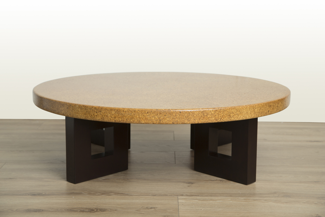 Mid-century modern round lacquered cork top coffee table with stained mahogany frame-shaped legs by Paul Frankl for Johnson Furniture. Model #5021 circa 1950.