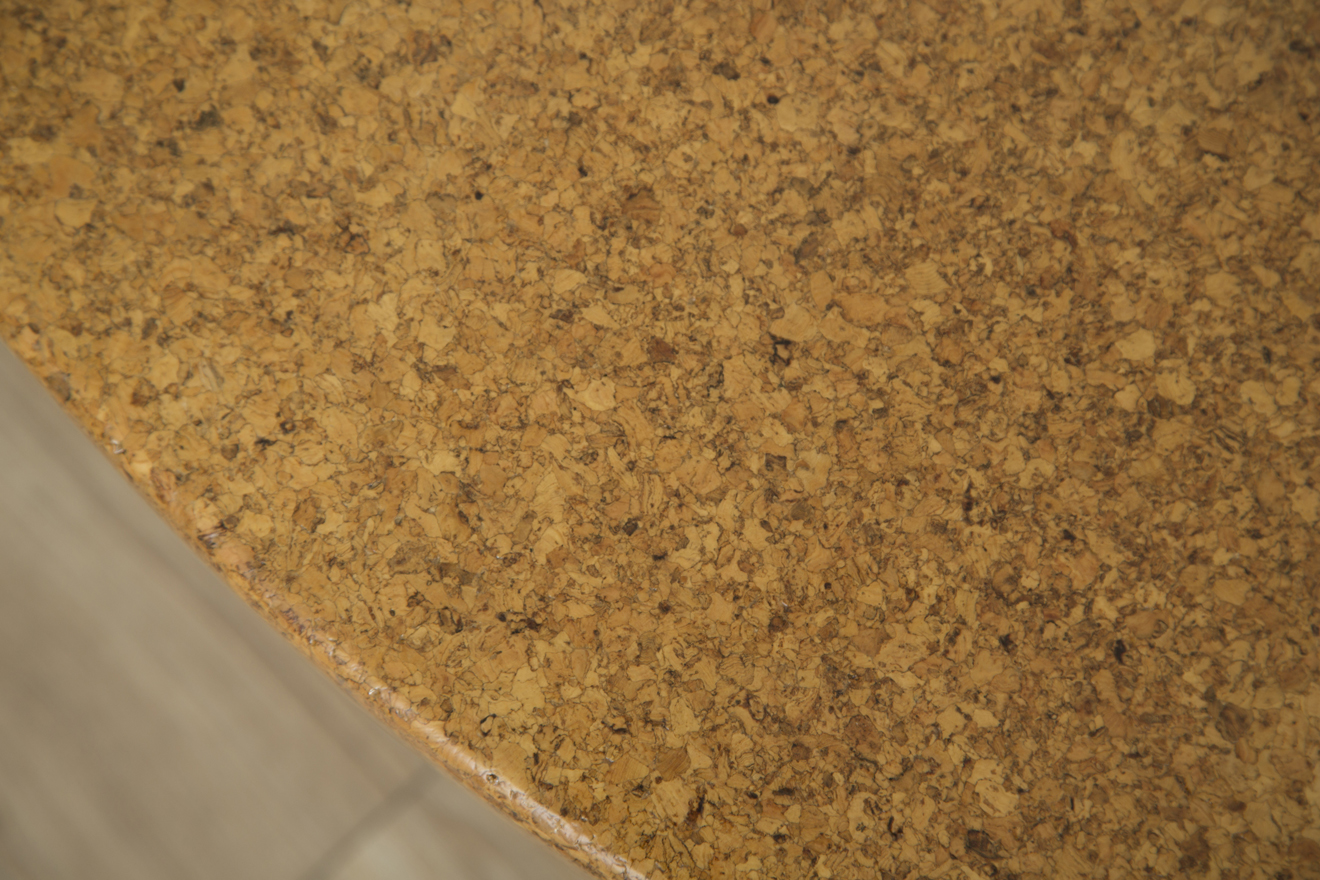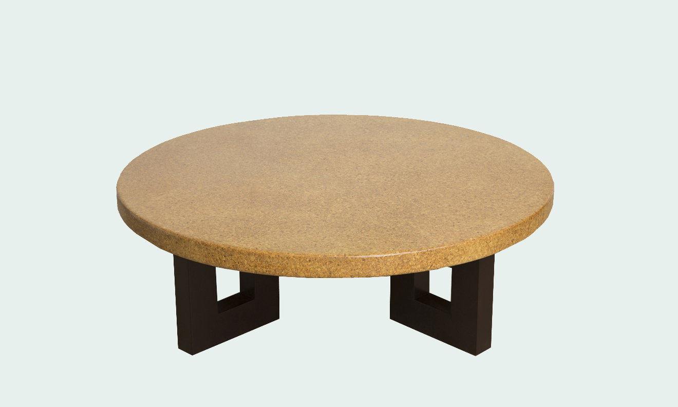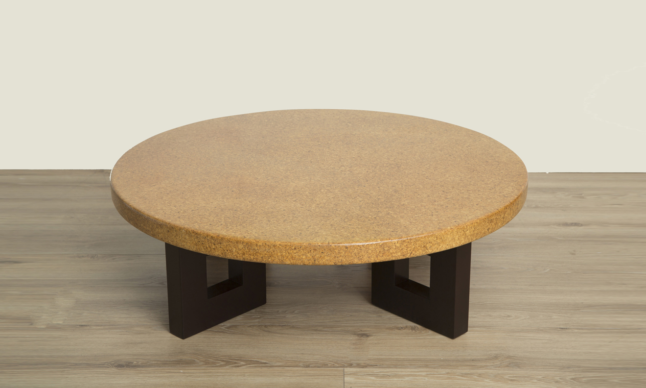 Mid-century modern round lacquered cork top coffee table with stained mahogany frame-shaped legs by Paul Frankl for Johnson Furniture. Model #5021 circa 1950.