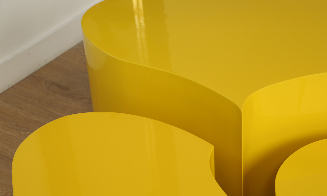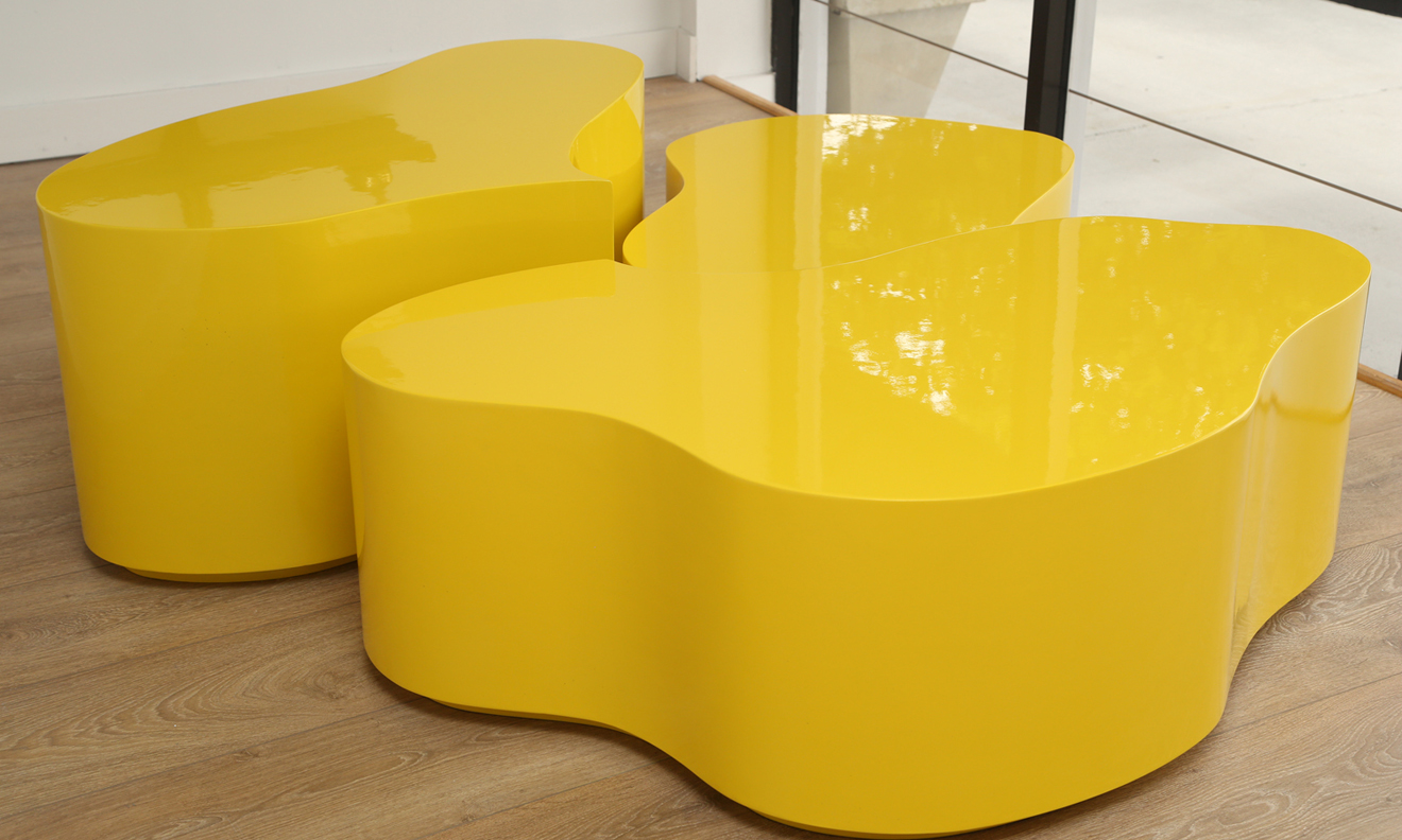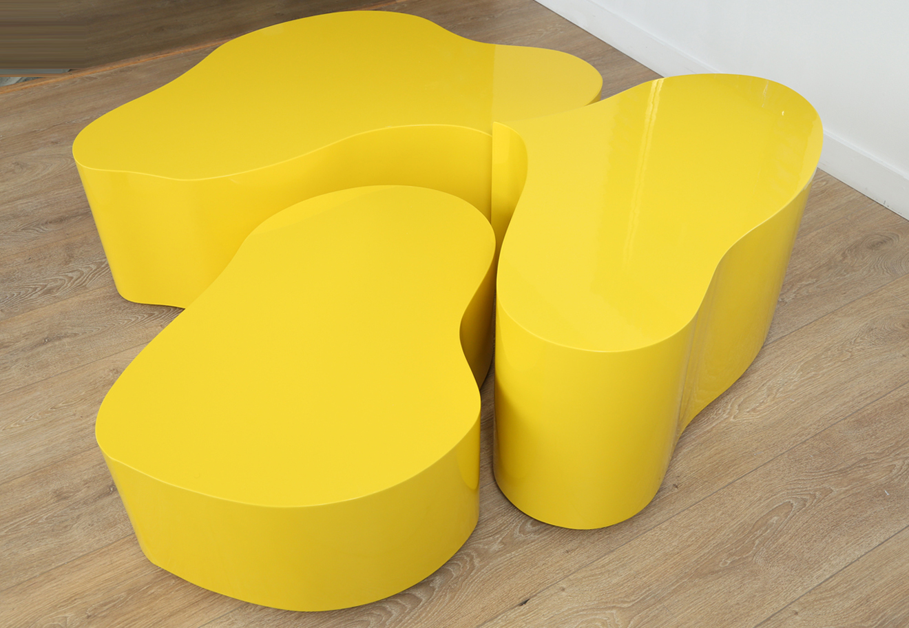 A vintage set of free-form coffee tables, newly lacquered in canary yellow.